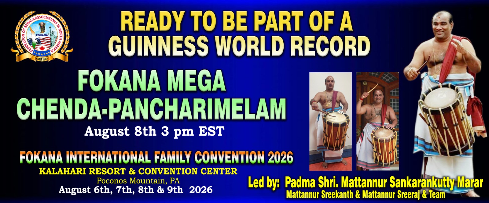 ഈ ചരിത്ര നിമിഷത്തിന് മാറ്റ് കൂട്ടുന്നത് ചെണ്ടയുടെ മാന്ത്രികൻ പത്മശ്രീ മട്ടന്നൂർ ശങ്കരൻകുട്ടിയുടെ സാന്നിധ്യമാണ്. ഒരു ഇതിഹാസ കലാകാരനോടൊപ്പം ഒരേ വേദിയിൽ, ഒരേ താളത്തിൽ ചെണ്ട കൊട്ടുക എന്നത് ഏതൊരു വാദ്യകലാകാരന്റെയും സ്വപ്നമാണ്. ആ സ്വപ്നം യാഥാർത്ഥ്യമാക്കാൻ ഫോക്കാന ഈ കൺവെൻഷനിലൂടെ സുവർണ്ണാവസരമൊരുക്കുന്നു. മട്ടന്നൂർ ശങ്കരൻകുട്ടിയുടെയും ടീമിന്റെയും നേതൃത്വത്തിൽ നടക്കുന്ന ഈ പഞ്ചാരിമേളത്തിൽ പങ്കാളികളാവുക എന്നത് വലിയൊരു ബഹുമതിയും പ്രിവിലേജുമാണ്. ഇതോടൊപ്പം നോർത്ത് അമേരിക്കയിലെ പ്രമുഖരായ ചെണ്ട ആശാന്മാരുടെ ഏകോപനം കൂടിയാണ് ഈ പഞ്ചാരിമേളത്തിൽ മുഴങ്ങുന്നത്. പ്രഗത്ഭനായ കലാകാരന്റെ വിരൽതുമ്പിലെ താളത്തിനൊപ്പം ചേരാൻ ലോകത്തിന്റെ വിവിധ കോണുകളിൽ നിന്നുള്ള ചെണ്ട പ്രേമികൾക്ക് അസുലഭ നിമിഷമായിരിക്കും ഇത് .