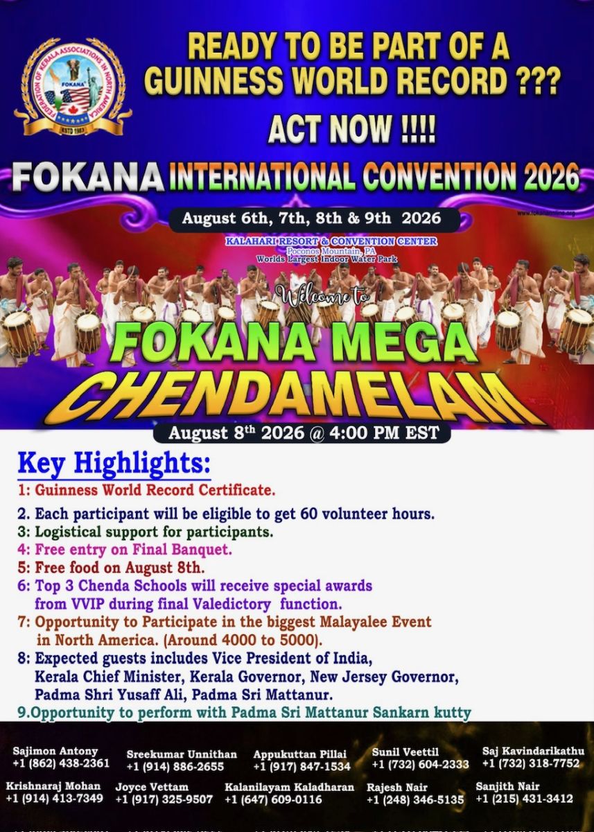 ന്യൂജേഴ്സി: ചെണ്ടയുടെ ഓരോ കൊട്ടും വെറുമൊരു താളമല്ല, അത് പ്രവാസിയുടെ അതിജീവനത്തിന്റെയും മണ്ണിലെ വേരുകളുടെയും ഉശിരുള്ള മുഴക്കമാണ്. ഫൊക്കാന (FOKANA) ഇന്റർനാഷണൽ ഫാമിലി കൺവെൻഷൻ 2026-ന്റെ ഭാഗമായി ഓഗസ്റ്റ് 8-ന് പെൻസിൽവേനിയയിലെ കലഹാരി റിസോർട്ടിൽ അരങ്ങേറുന്ന "പഞ്ചാരി മേളം " വെറുമൊരു ഗിന്നസ് വേൾഡ് റെക്കോർഡ് ശ്രമമല്ല; മറിച്ച് ലോകമെമ്പാടുമുള്ള മലയാളികളെ ഒരേ താളത്തിൽ കോർത്തിണക്കുന്ന ഒരു മഹാസംഗമമാണ്.