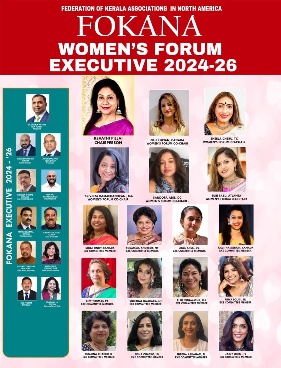 ന്യൂ യോർക്ക് :അമേരിക്കൻ-കാനേഡിയൻ മലയാളികളുടെ സംഘടനകളുടെ സംഘടനയായ ഫൊക്കാനയുടെ 2024-26 കാലയളവിലേക്കുള്ള വിമന്സ് ഫോറം ഭാരവാഹികളെ തെരെഞ്ഞെടുത്തു. ഭാരവാഹികളായി സുബി ബാബു (വിമൻസ് ഫോറം സെക്രട്ടറി),ബിലു കുര്യൻ (കോ ചെയർ ), ഷീല ചെറു (കോ ചെയർ ), ശ്രീവിദ്യ രാമചന്ദ്രൻ (കോ ചെയർ ), സരൂപാ അനില് (കോ ചെയർ ), ഷോജി സിനോയ് (എക്സിക്യൂട്ടീവ് കമ്മിറ്റി ), ശോശാമ്മ ആൻഡ്രൂസ് (എക്സിക്യൂട്ടീവ് കമ്മിറ്റി ), അബ്ജ അരുൺ (എക്സിക്യൂട്ടീവ് കമ്മിറ്റി ),പ്രിയ ലൂയിസ് (എക്സിക്യൂട്ടീവ് കമ്മിറ്റി ),സുനൈന ചാക്കോ (എക്സിക്യൂട്ടീവ് കമ്മിറ്റി ),ഉഷ ചാക്കോ (എക്സിക്യൂട്ടീവ് കമ്മിറ്റി ),ലിസി തോമസ് (എക്സിക്യൂട്ടീവ് കമ്മിറ്റി ),ശീതൾ ദ്വാരക (എക്സിക്യൂട്ടീവ് കമ്മിറ്റി ),എൽസി വിതയത്തിൽ (എക്സിക്യൂട്ടീവ് കമ്മിറ്റി ),കവിത മേനോൻ (എക്സിക്യൂട്ടീവ് കമ്മിറ്റി ),ഷീന എബ്രഹാം (എക്സിക്യൂട്ടീവ് കമ്മിറ്റി ),ജൈൻറ്ജോൺ (എക്സിക്യൂട്ടീവ് കമ്മിറ്റി ) എന്നിവരെ തെരഞ്ഞെടുത്തതായി വിമൻസ് ഫോറം ചെയർ പേഴ്സൺ രേവതി പിള്ള അറിയിച്ചു.