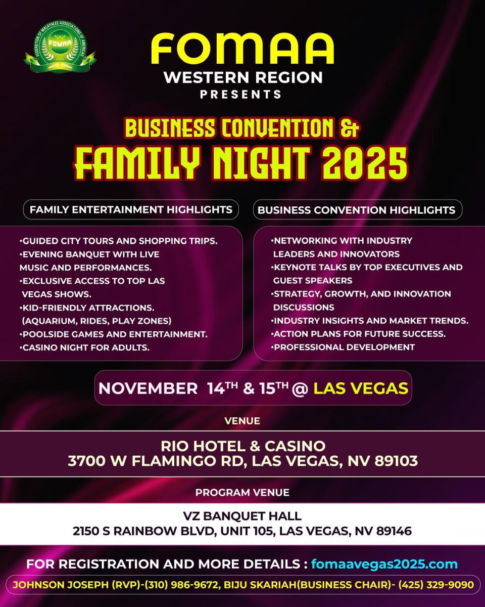 കാലിഫോർണിയ: ഫോമാ വെസ്റ്റേൺ റീജിയന്റെ ആഭിമുഖ്യത്തിൽ ലാസ് വേഗസിൽ വെച്ച് നവംബർ 14, 15 തീയതികളിൽ ബിസിനസ് കൺവൻഷനും, ഫാമിലി നൈറ്റും ഗംഭീരമായി നടത്തുവാൻ റീജിയണൽ കമ്മറ്റി തീരുമാനിച്ചു. ലാസ് വേഗസിലെ പ്രശസ്തമായ റിയോ കാസിനോ ഹോട്ടലുമായി ഇതുസംബന്ധിച്ച് കരാർ ഒപ്പുവെച്ചു . ഈ വരുന്ന നവംബർ മാസത്തിലെ ഹേമന്തത്തിന്റെ കുളിരിൽ നിശയുണരുമ്പോൾ സജീവമാകുന്ന ലാസ് വേഗാസിന്റെ മാസ്മരികത ആസ്വദിച്ചുകൊണ്ട് കുടുംബമായും അല്ലാതെയും ഈ പ്രത്യേക പരിപാടിയിൽ പങ്കെടുക്കുവാൻ എല്ലാവര്ക്കും അവസരമൊരുക്കുന്നതാണ്.