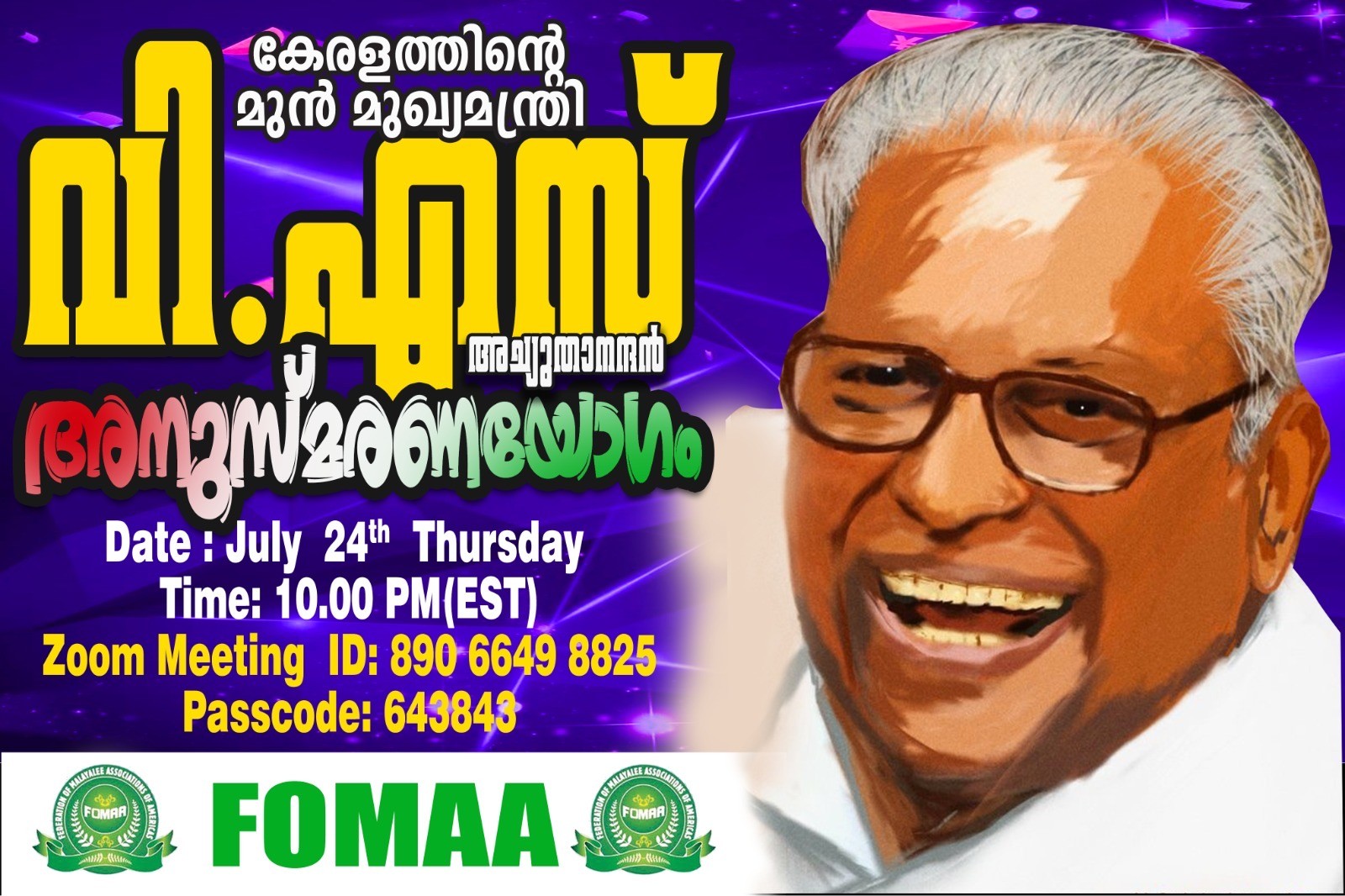 ന്യൂ യോർക്ക് : കഴിഞ്ഞ ദിവസം വിടപറഞ്ഞ, വിപ്ലവ സൂര്യൻ, മുതിർന്ന കമ്മ്യൂണിസ്റ് നേതാവും, കേരളത്തിൻറെ മുൻ മുഖ്യമന്ത്രിയുമായ സഖാവ് വി. എസ്. അച്യുതാനന്ദനോടു അമേരിക്കൻ മലയാളികൾക്കുള്ള ആദരവ് പ്രകടിപ്പിക്കുന്നതിനുവേണ്ടി, ഫെഡറേഷൻ ഓഫ് മലയാളി അസോസിയേഷൻസ് ഓഫ് അമേരിക്കാസ് (ഫോമാ) അനുസ്മരണ യോഗം സംഘടിപ്പിക്കുന്നു. ജൂലൈ 24-)0 തീയതി വ്യാഴാഴ്ച രാത്രി 10 മണിക്ക് (EST) സൂമിലൂടെ നടത്തുന്ന ഈ യോഗത്തിലേക്ക് എല്ലാ മലയാളികളേയും സ്വാഗതം ചെയ്യുന്നു. ഫോമ പ്രസിഡൻറ് ബേബി മണക്കുന്നേൽ അധ്യക്ഷത വഹിക്കുന്ന യോഗത്തിൽ കേരളത്തിൽ നിന്നും മന്ത്രിമാരും, എം.എൽ.എ മ്മാരും ഉൾപ്പെടെ വിവിധ രാഷ്ട്രീയ നേതാക്കളും പങ്കെടുക്കുന്നതാണ്.