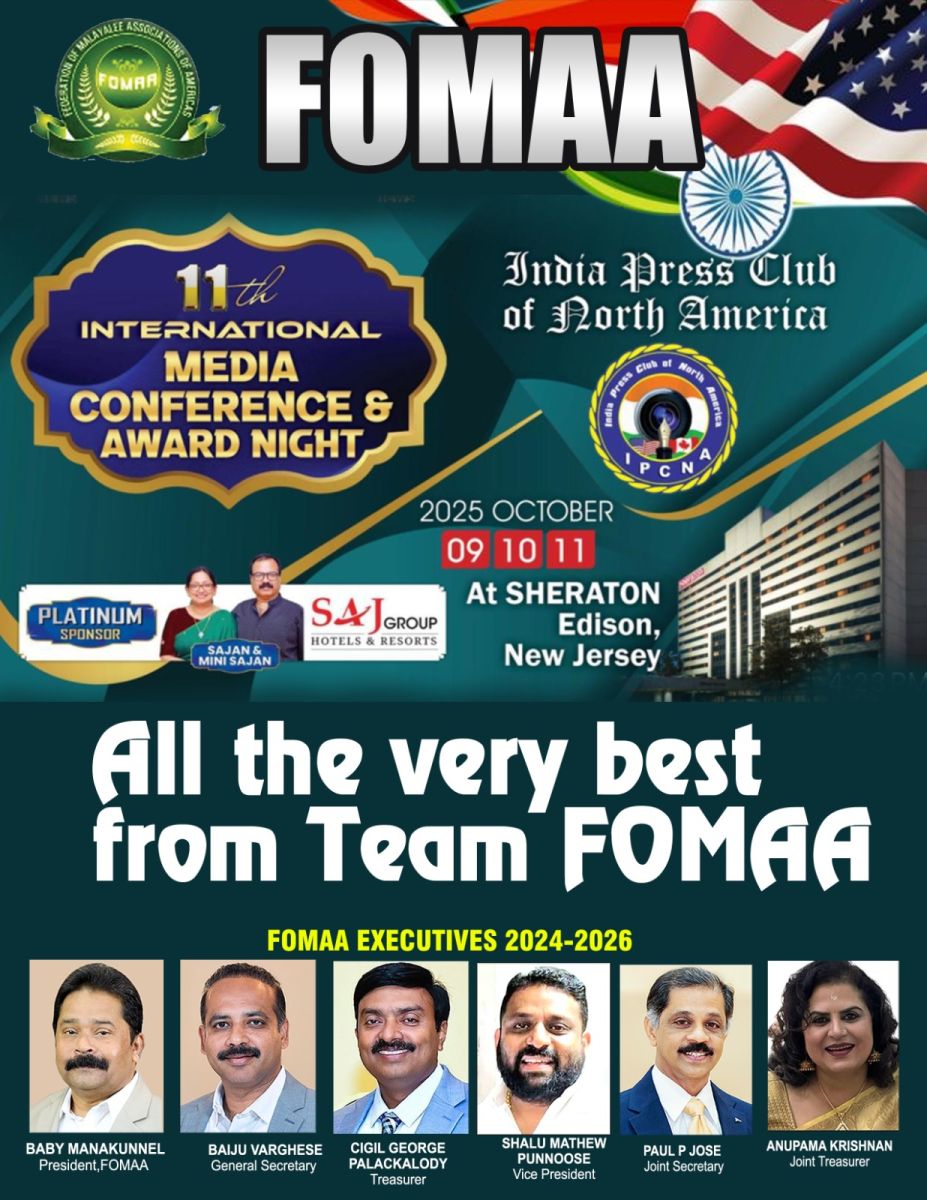 ന്യൂയോർക് : ഒക്ടോബർ ഒൻപതു, പത്തു, പതിനൊന്നു തീയതികളിൽ ന്യൂജേഴ്സിയിലെ എഡിസൺ ഷെറാട്ടൺ ഹോട്ടലിൽ വച്ച് നടക്കുന്ന ഇന്ത്യ പ്രസ് ക്ലബ് ഓഫ് നോർത്ത് അമേരിക്കയുടെ പതിനൊന്നാമത് അന്താരാഷ്ട്ര മാധ്യമ കോൺഫറൻസിന് ആശംസകൾ നേർന്നു ഫോമ !
