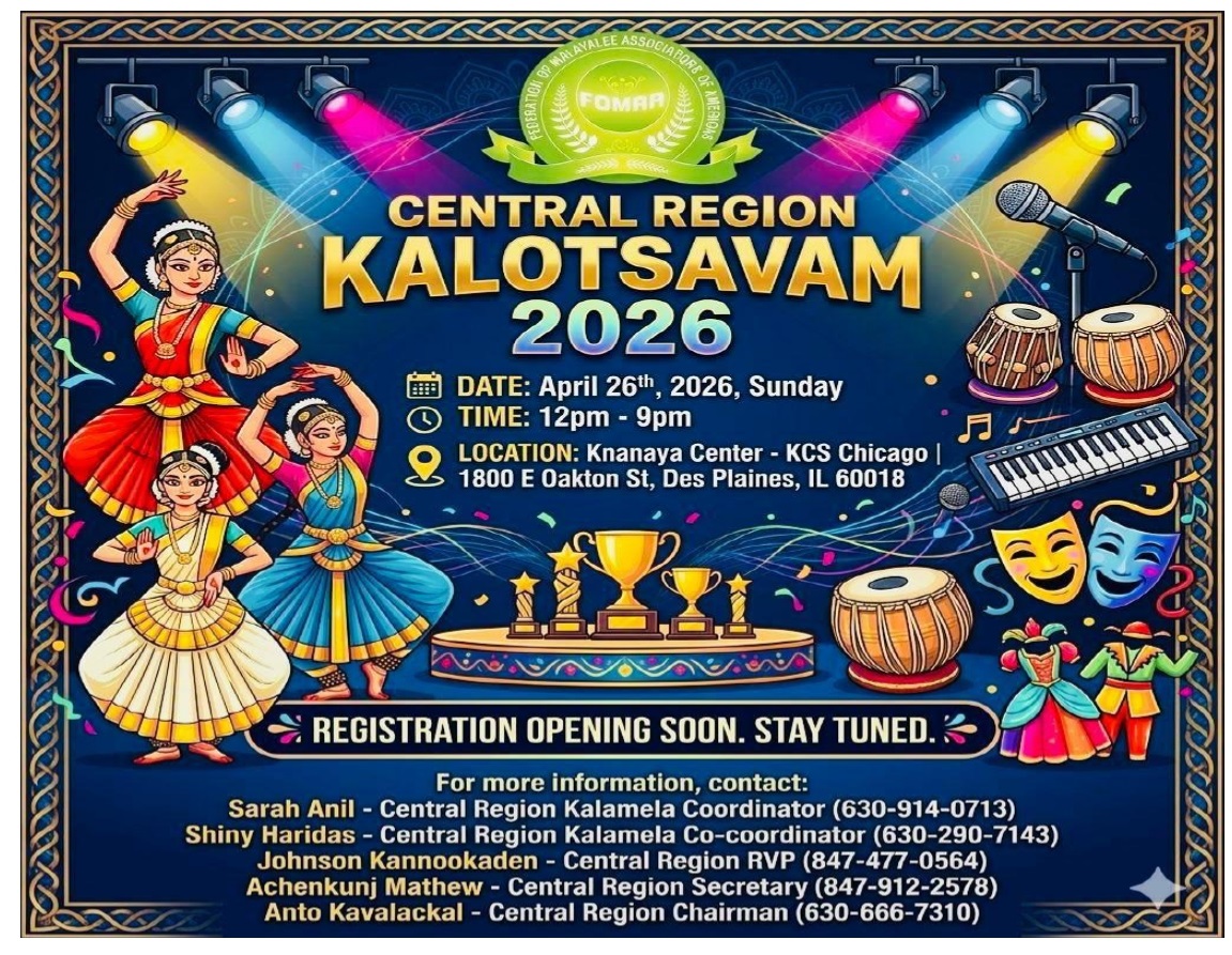 ചിക്കാഗോ : ഫോമാ സെൻട്രൽ റീജിയന്റെ ആഭിമുഖ്യത്തിലുള്ള ഈ വർഷത്തെ കലാമേള ,ഡെസ്പ്ലെയിൻസിലുള്ള ക്നാനായ കമ്മ്യൂണിറ്റി സെന്ററിൽ വച്ച് 2026 ഏപ്രിൽ 26ന് നടത്തപ്പെടുന്നതാണ് .കലാമേളയുടെ വിജയകരമായ നടത്തിപ്പിനായി വിവിധ കമ്മിറ്റികൾ രൂപീകരിച്ചു .