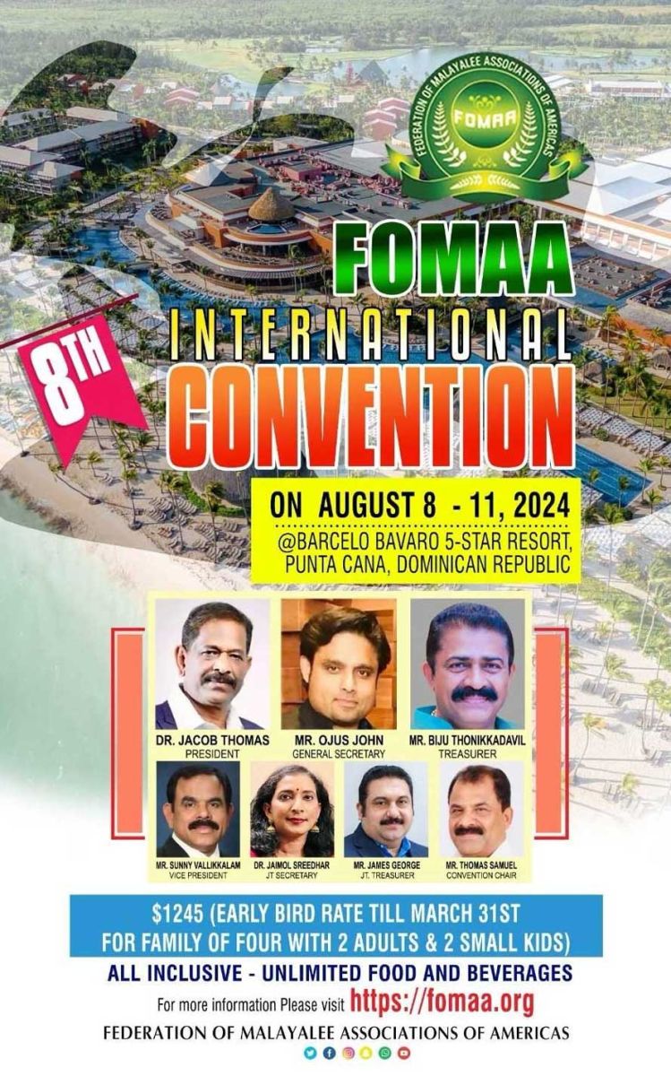 ഓഗസ്റ്റ് 8 മുതൽ 11 വരെ ഡൊമിനിക്കൻ റിപ്പബ്ലിക്കിലെ ലോകപ്രശസ്തമായ പുന്റാ കാനയിലെ ബാർസലോ ബവാരോ പാലസ് 'ഓൾ ഇൻക്ലൂസീവ്' ഫൈവ് സ്റ്റാർ ഫാമിലി റിസോർട്ടിലാണ് ഇന്റർനാഷണൽ കൺവെൻഷൻ നടത്തുന്നത്. ആഗോള മലയാളി സംഘടനകളുടെ ചരിത്രത്തിൽ ആദ്യമായിട്ടാണ് ഇത്രയും വിപുലമായ കൺവെൻഷൻ നടത്തുന്നത്. കൂട്ടായ്മയുടെ കരുത്തിൽ കൺവെൻഷൻ വിജയകരമായി പൂർത്തിയാക്കാനുള്ള ശ്രമത്തിലാണ് ഭാരവാഹികൾ.