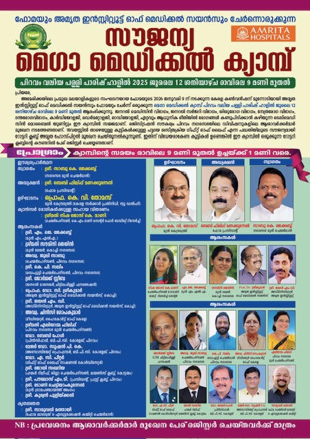 പിറവം: അമേരിക്കയിലെ മലയാളി സംഘടനയായ ഫെഡറേഷൻ ഓഫ് മലയാളി അസോസിയേഷൻ ഓഫ് അമേരിക്ക (ഫോമ) യുടെ പ്രസിഡന്റും പിറവം സ്വദേശിയുമായ ബേബി ഫിലിപ്പ് മണക്കുന്നേലിന്റെ പ്രത്യേക താല്പര്യ പ്രകാരം അമൃത ഇൻസ്റ്റിറ്റ്യൂട്ട് ഓഫ് മെഡിക്കൽ സയൻസിന്റെ സഹകരണത്തോടെയാണ്ൽ പിറവം വലിയപള്ളി പാരീഷ് ഹാളിൽ മെഗാ മെഡിക്കൽ ക്യാമ്പ് സംഘടിപ്പിച്ചു ക്യാമ്പിന്റെ ഉദ്ഘാടനം മുൻകേന്ദ്ര മന്ത്രി പ്രൊഫസർ കെ വി തോമസ് നിർവഹിച്ചു ക്യാൻസർ രോഗികക്കുള്ള കിറ്റുകളുടെ വിതരണം കെ എം മാണി ബജറ്റ് റിസേർച് സെന്റർ ചെയർപേഴ്സൺ നിഷ ജോസ് കെ മാണി നിർവഹിച്ചു, നഗരസഭാ ചെയർപേഴ്സൺ ജൂലി സാബു അധ്യക്ഷത വഹിച്ച യോഗത്തിൽ മുൻ നഗരസഭ ചെയർമാൻ സാബു കെ ജേക്കബ് സ്വാഗതം പറഞ്ഞു. മുൻ എം.ൽ. എ എം. ജെ ജേക്കബ്,വൈസ് ചെയർമാൻ കെ പി സലിം, അമൃത ഇൻസ്റ്റിറ്റ്യൂട്ട് ഓഫ് മെഡിക്കൽ സയൻസ് പ്രൊഫസർ ഡോ സി.ശ്രീകുമാർ, അഡ്മിനിസ്റ്റേറ്റർ ജയൻ എം ഡി, കേരള ഹൈക്കോട്ട് മീഡിയേറ്റർ അഡ്വ: ചിൻസി ഗോപകുമാർ, മുൻ നഗരസഭ ചെയർപേഴ്സൺ ഏലിയാമ്മ ഫിലിപ്പ് ,പിറവം ബിപിസി കോളേജ് പ്രിൻസിപ്പൽ ഡോ ബേബി പോൾ, അസിസ്റ്റൻറ് പ്രൊഫസർ ഡോ സുഷൻ പി കെ, ഗിഫ്റ്റ് ഓഫ് ലൈഫ് നാഷണൽ കോഡിനേറ്റർ ഡോ എ സി പീറ്റർ, ലയൺസ് ക്ലബ് കോട്ടയം ഹങ്കർ റിലീഫ് ജില്ലാ ചെയർമാൻ ജോയി സക്കറിയ കുര്യൻ പുളിക്കൽ ജെയിംസ് ഓണശ്ശേരിൽ പി എം ഷാജു ,സാജു ചേന്നാട്ട്, സുരേഷ് ചന്ദേലി ,പോൾ കൊമ്പനാൽ, ഏലിയാസ് വെട്ടുകുഴിയിൽ, മാത്യു മൈലാടി തുടങ്ങിയവർ ആശംസകൾ പറഞ്ഞു യോഗത്തിനു ആശ പ്രതിനിധി ലിസ്സി വർഗീസ് നന്ദി പറഞ്ഞു