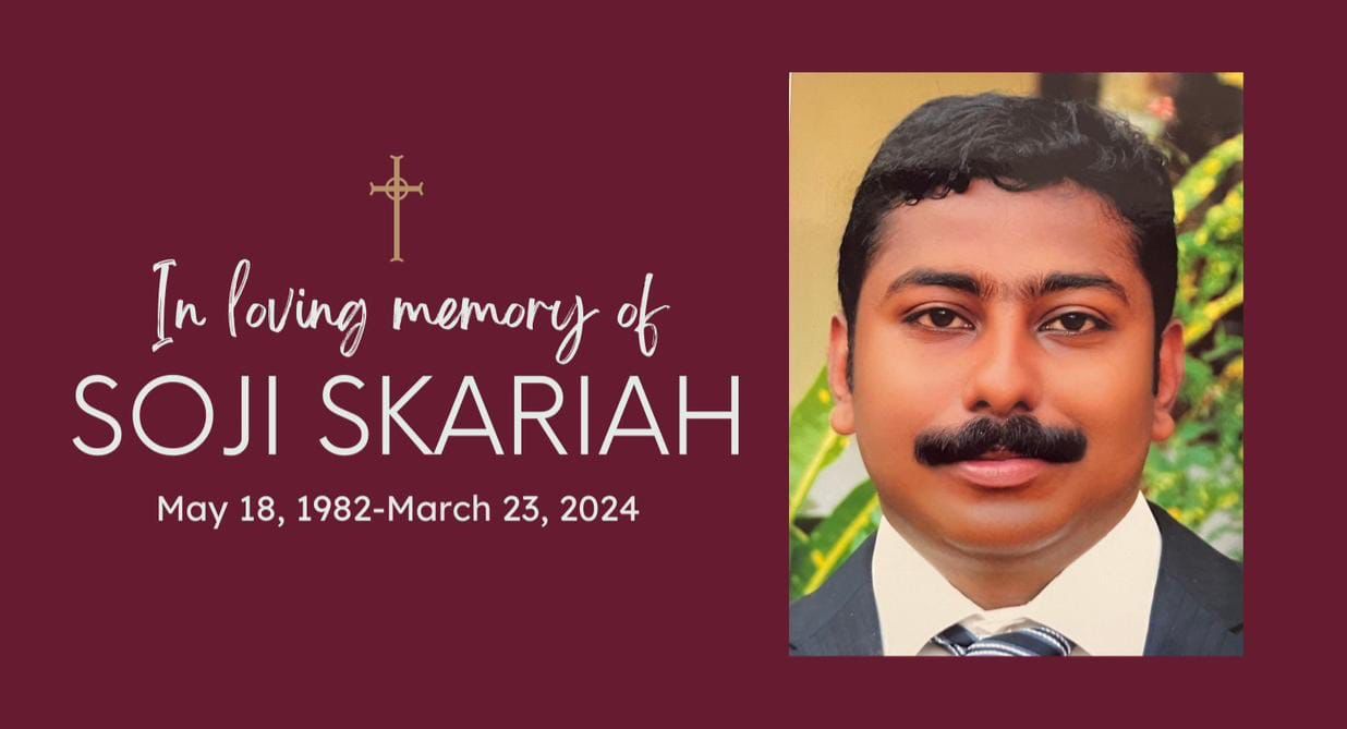 ഫിലഡൽഫിയ: കഴിഞ്ഞ ദിവസം ഫിലഡൽഫിയയിൽ നിര്യാതനായ സോജി സ്കറിയായുടെ (42) പൊതു ദർശനവും സംസ്ക്കാര ചടങ്ങുകളും മാർച്ച് 28 ന് വ്യാഴാഴ്ച രാവിലെ 9 :15 മുതൽ ഒരു മണി വരെയുള്ള സമയങ്ങളിൽ ഫിലഡൽഫിയ അസ്സൻഷൻ മാർത്തോമാ പള്ളിയിൽ വച്ച് നടത്തപ്പെടും. (Ascension Mar Thoma Church, 10197 Northeast Avenue, Philadelphia, PA 19116) തുടർന്ന് 1 :25 ന് ഇടവക വികാരി റവ. ബിബി മാത്യു ചാക്കോയുടെ നേതൃത്വത്തിൽ ലോൺവ്യൂ സെമിത്തേരിയിൽ സംസ്കാരവും നടക്കും. (Lawnview Cemetery, 500 Huntingdon Pike, Rockledge, PA 19046)