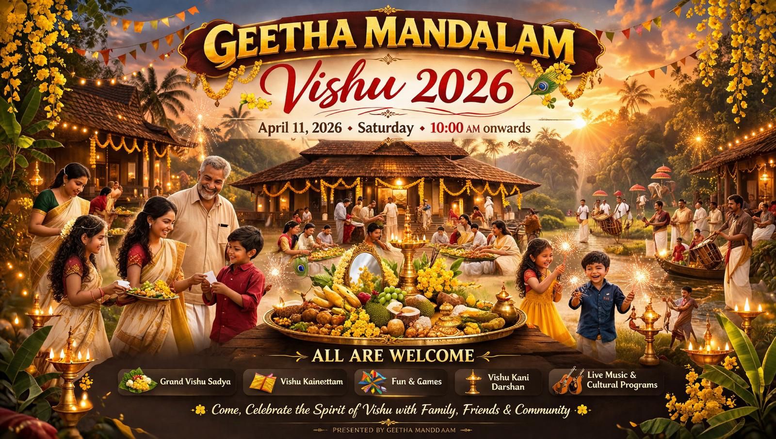 ചിക്കാഗോ ഗീതാമണ്ഡലം സംഘടിപ്പിക്കുന്ന വിഷു ആഘോഷം കേരളത്തിന്റെ സമ്പന്നമായ പാരമ്പര്യവും ആത്മീയ-സാംസ്കാരിക മൂല്യങ്ങളും ഒരുമിച്ച് അനുഭവിപ്പിക്കുന്ന ഒരു ഹൃദയസ്പർശിയായ സംഗമമായിരിക്കും. ഉണ്ണിക്കണ്ണന്റെ സന്നിധിയിൽ ഒരുക്കുന്ന വിഷുക്കണി ഭക്തിനിറഞ്ഞ അന്തരീക്ഷം സൃഷ്ടിക്കുമ്പോൾ, വിഷു കൈനീട്ടം സ്നേഹത്തിന്റെയും പങ്കിടലിന്റെയും സന്ദേശം പകരും. കുട്ടികൾ നയിക്കുന്ന ഭജനകളും നാരായണീയ പാരായണവും ചടങ്ങുകൾക്ക് ആത്മീയത നൽകും. കുട്ടികളുടെയും സ്ത്രീകളുടെയും കലാപരിപാടികൾ ആഘോഷത്തിന് നിറവും ചൈതന്യവും കൂട്ടിച്ചേർക്കും. വിഭവസമൃദ്ധമായ വിഷുസദ്യയും പാരമ്പര്യ ആചാരങ്ങളും ചേർന്ന് ഈ വിഷു ആഘോഷം എല്ലാ പ്രായക്കാരുടെയും ഹൃദയത്തിൽ നിലനിൽക്കുന്ന ദിവ്യവും സ്മരണീയവുമായ അനുഭവമായി മാറും.