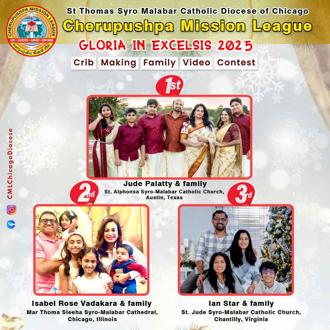 ചിക്കാഗോ: ചെറുപുഷ്പ മിഷൻ ലീഗ് (സി.എം.എൽ.) ചിക്കാഗോ രൂപത സമിതി സംഘടിപ്പിച്ച 'ഗ്ലോറിയ ഇൻ എക്സിൽസിസ്' - പുൽക്കൂട് നിർമാണ ഫാമിലി വീഡിയോ മത്സരത്തിന്റെ വിജയികളെ പ്രഖ്യാപിച്ചു.