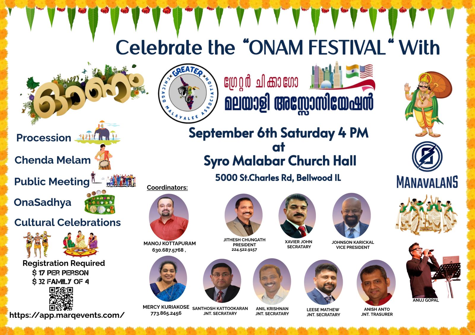 ഓണാഘോഷത്തിലേക്കും പൊതുസമ്മേളത്തിലേക്കും എല്ലാ മലയാളികളെയും കുടുംബസമേതം ഗ്രെയ്റ്റർ ഷിക്കാഗോ മലയാളീ അസോസിയേഷൻ (GCMA) സ്വാഗതം ചെയ്യുന്നതായി സംഘാടകർ അറിയിച്ചു. മനോജ് തോമസ് കോട്ടപ്പുറം , മേഴ്സി കുര്യാക്കോസ് എന്നിവർ മുഖ്യ സംഘാടകർ ആയിരിക്കും . ഗ്രെയ്റ്റർ ചിക്കാഗോയിലെ ഏറ്റവും മികച്ച ഡാൻസ് ഗ്രൂപ്പ് ആയ മണവാളൻസ് ചിക്കാഗോ അവതരിപ്പിക്കുന്ന ഡാൻസ് മെഡലി , തിരുവാതിര , ഗായകരായ അനുജ് ഗോപാലിന്റെ ഗാനങ്ങൾ , ചെണ്ടമേളം , ഓണം ഫോട്ടോ സെഷൻ , എന്നിവ ഉണ്ടായിരിക്കും .
