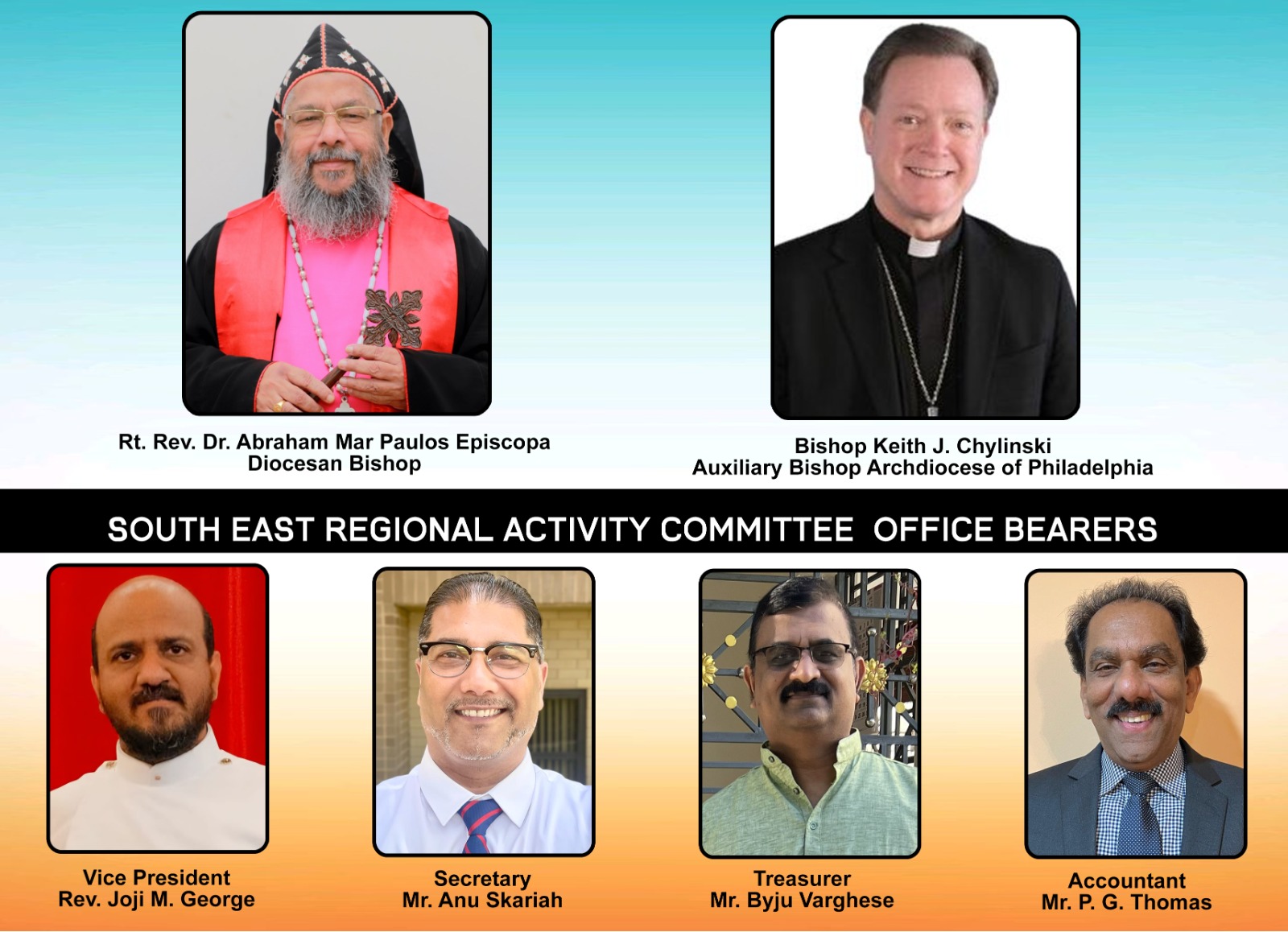 വൈസ് പ്രസിഡണ്ട് റെവ. ജോജി എം ജോർജ്, സെക്രട്ടറി അനു സ്കറിയ സൗത്ത് ഈസ്റ്റ് റീജനൽ ആക്ടിവിറ്റി കമ്മറ്റി അംഗങ്ങൾ- ട്രസ്റ്റി - ബൈജു വർഗീസ്, അക്കൗണ്ടൻറ് - പി .ജി തോമസ് ,ബോർഡ് മെമ്പേഴ്സ് - ബിൻസി ജോൺ, ഡോക്ടർ ഏലിയാസ് എബ്രഹാം, ഡോക്ടർ മാത്യു ടി. തോമസ്, വത്സ മാത്യു, ജോസഫ് കുരുവിള, റെജി ജോസഫ് , ഷൈജു ചെറിയാൻ എന്നിവർ ഏവരെയും ഈ ക്രിസ്തീയ ദിവ്യ സംഗീത വിരുന്നിലേക്ക് സ്വാഗതം ചെയ്തു.