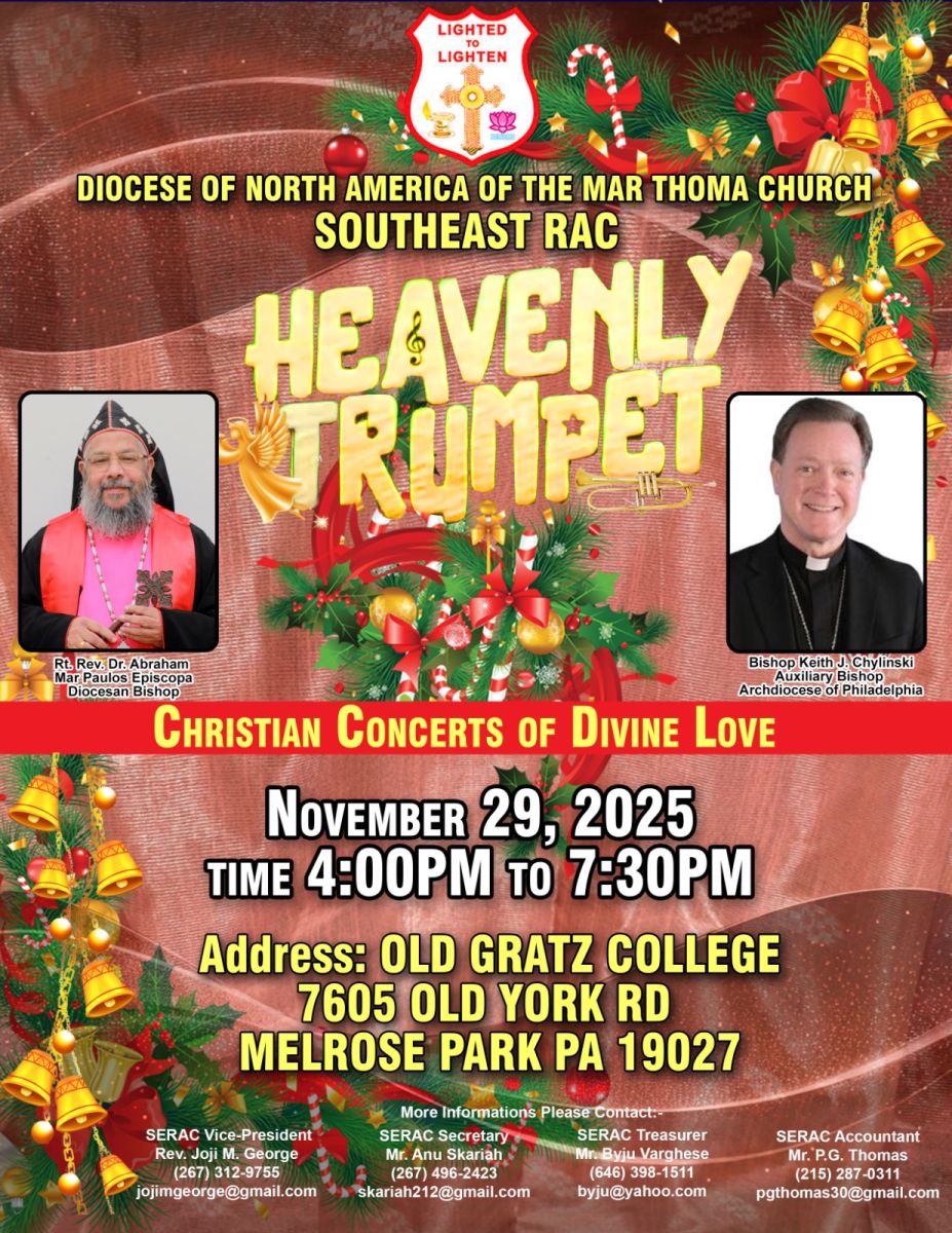 ഫിലഡൽഫിയ - മാർത്തോമാ സഭയുടെ നോർത്ത് അമേരിക്കൻ ഭദ്രാസനത്തിന്റെ ആഭിമുഖ്യത്തിൽ സൗത്ത് ഈസ്റ്റ് റീജനൽ ആക്ടിവിറ്റി കമ്മിറ്റിയും സഭയുടെ സംഗീത വിഭാഗമായ ഡി എസ് എം സി യും സംയുക്തമായി 2025 നവംബർ മാസം 29 ആം തീയതി ശനിയാഴ്ച 4:00 മുതൽ 7 30 വരെ പെൻസിൽവേനിയയിലെ മെല്റോസ് പാർക്കിൽ സ്ഥിതി ചെയ്യുന്ന OLD GRATZ കോളേജ് ഓഡിറ്റോറിയത്തിൽ ( 7605 old York Rd., Melrose Park, PA-19027) വച്ച് നടത്തപ്പെടുന്ന ഹെവൻലി ട്രമ്പറ്റിന്റെ 2025 ഒരുക്കങ്ങൾ പൂർത്തിയായതായി ഭാരവാഹികൾ അറിയിച്ചു.
