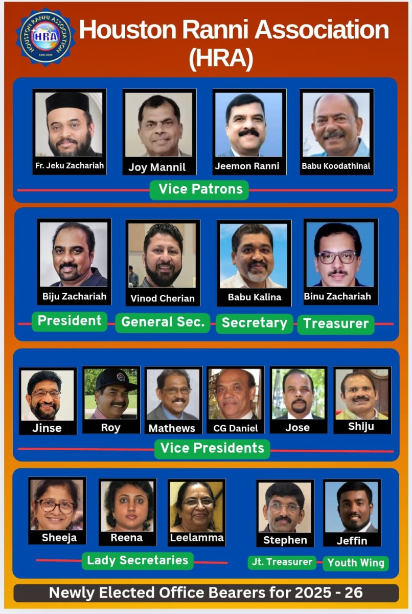 ഹൂസ്റ്റൺ.ടെക്സാസ് സംസ്ഥാനത്തെ ഏറ്റവും ശക്തമായ പ്രാദേശിക കൂട്ടായ്മയായ ഹൂസ്റ്റൺ റാന്നി അസോസിയേഷന് (എച്ച്. ആർ.എ) 2025-26 ലെ പുതിയ ഭാരവാഹികളെ ഐക്യകണ്ഠേനേ തെരഞ്ഞെടുത്തു. ഹൂസ്റ്റണിലെ സാമൂഹ്യ സാംസ്കാരിക രംഗത്തെ നിറസാന്നിധ്യങ്ങളാണ്. HRA യുടെ നേതൃരംഗത്ത് എത്തിയിട്ടുള്ളത്.