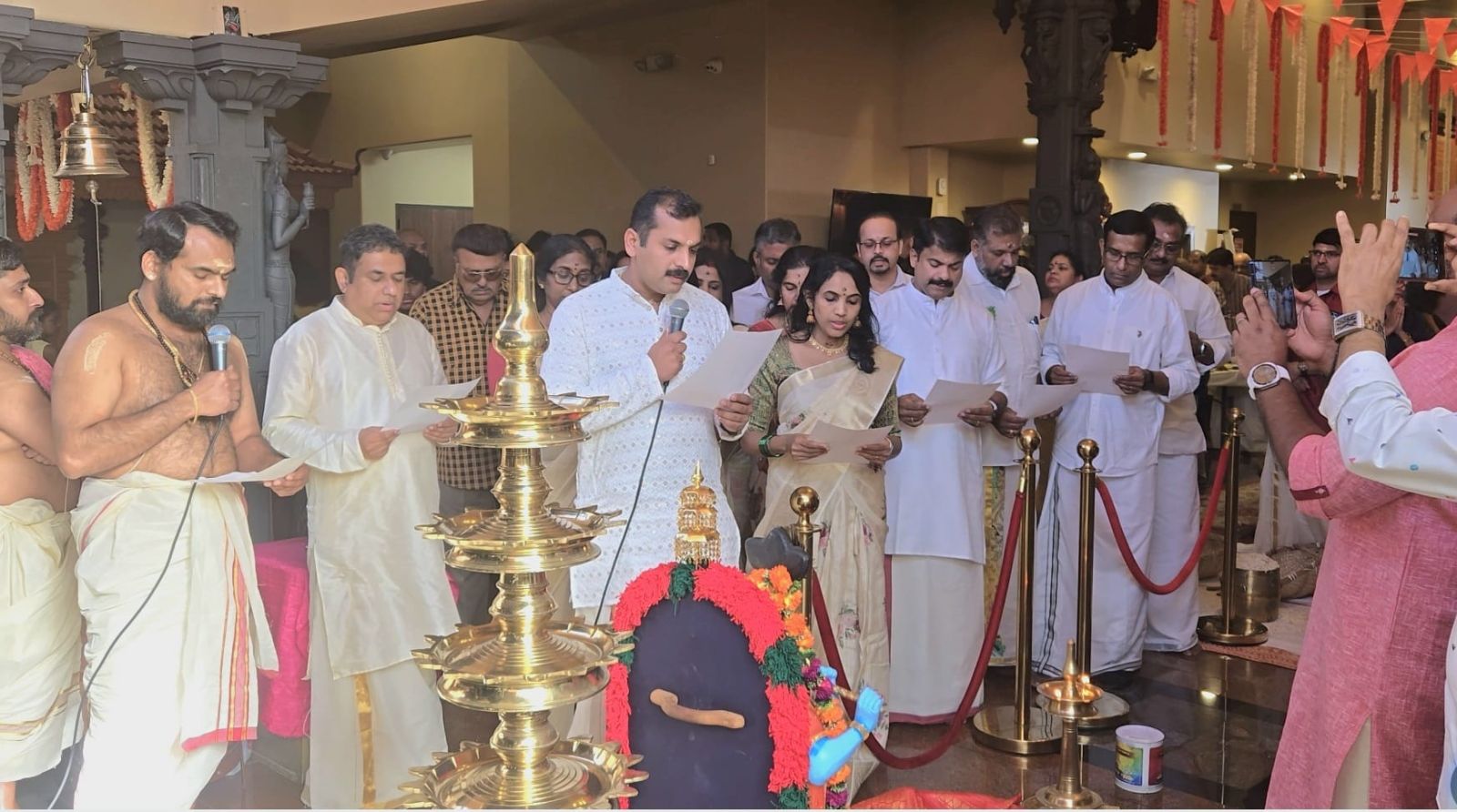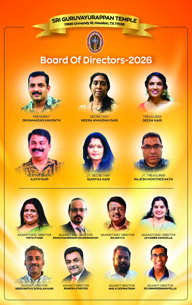 ഭക്തിയും ദിവ്യകാരുണ്യവും നിറഞ്ഞ അന്തരീക്ഷത്തിൽ, ഹ്യൂസ്റ്റൺ ശ്രീ ഗുരുവായൂരപ്പൻ ക്ഷേത്രത്തിന്റെ പുതുതായി തിരഞ്ഞെടുക്കപ്പെട്ട ഡയറക്ടർ ബോർഡ് ഇന്ന് ഔദ്യോഗികമായി ചുമതലയേറ്റു. ധർമ്മം, സേവ, സമൂഹ ഐക്യം എന്നിവയോടുള്ള പുതുക്കിയ പ്രതിബദ്ധതയുടെ പ്രതീകമായ ആത്മീയ ആഘോഷങ്ങളാലും കൂട്ടായ പ്രാർത്ഥനകളാലും ഈ ചടങ്ങ് ശ്രദ്ധേയമായി. . ഈ ശുഭദിനത്തിൽ, ക്ഷേത്രത്തിന്റെ പുതിയ പ്രസിഡന്റായി ഡോ. രാംദാസ് കണ്ടത്ത് ഔദ്യോഗികമായി ചുമതലയേറ്റു. പുതിയ ഭരണ സമതി അംഗങ്ങൾ: പ്രസിഡന്റ് -Dr. രാംദാസ് കണ്ടത്ത്, സെക്രട്ടറി- മീര ആനന്ദ്, ട്രഷറർ- ദീപ നായർ, വൈസ് പ്രസിഡന്റ് -അജിത് നായർ, ജോയിന്റ് സെക്രട്ടറി -സുനിത നായർ, ജോയിൻറ് ട്രഷറർ- രാജേഷ് മൂത്തേഴത്തു, എക്സിക്യൂട്ടീവ് ഡിറക്ടർസ്, വിദ്യ,P. നായർ, രാമചന്ദ്രൻ വടക്കേമഠം, V N രാജൻ, ജയശ്രീ കണ്ണോളിൽ, ഡയറക്ടേഴ്സ് : ശ്രീകാന്ത് ഗോപാലൻ നായർ, രമേശ് അത്തിയോടി, അനിൽ K ഗോപിനാഥൻ, Dr. ഉണ്ണികൃഷ്ണ പിള്ള ക്ഷേത്രത്തിന്റെ ആത്മീയവും അടിസ്ഥാന സൗകര്യപരവുമായ അടിത്തറ ശക്തിപ്പെടുത്തുകയെന്ന ലക്ഷ്യത്തോടെ, വിനയത്തോടും ഭക്തിയോടും കൂടി ഭക്തരെ അഭിസംബോധന ചെയ്തുകൊണ്ട്, പുതിയ ഡയറക്ടർ ബോർഡിന്റെ പുതുവത്സര ദർശനവും പ്രതിജ്ഞകളും അദ്ദേഹം പങ്കുവെച്ചു.പുരോഹിത മന്ദിരങ്ങളുടെ വികസനം, പവിത്രമായ ചുറ്റുവിളക്കിന്റെ നവീകരണം, സനാതന ധർമ്മത്തിന്റെ സമ്പന്നമായ പൈതൃകവും ആത്മീയ സൗന്ദര്യശാസ്ത്രവും പ്രതിഫലിപ്പിക്കുന്ന ചുറ്റുമതിലിൽ പരമ്പരാഗത ചുവർചിത്രങ്ങൾ നിർമ്മിക്കൽ എന്നിവയാണ് പ്രധാന പ്രമേയങ്ങൾ. കൂടാതെ, ക്ഷേത്രത്തിനും ഭക്തർക്കും വലിയ ആത്മീയ പ്രാധാന്യമുള്ള ഒരു സംഭവമായ പവിത്രമായ ദ്വജപ്രതിഷ്ഠ ആഘോഷിക്കാനുള്ള പദ്ധതികൾ ബോർഡ് പ്രഖ്യാപിച്ചു. ക്ഷേത്രത്തിലെ എല്ലാ ആചാരങ്ങളിലും ആത്മീയ അനുഷ്ഠാനങ്ങളിലും എല്ലാ ഭക്തരും സജീവമായും പൂർണ്ണഹൃദയത്തോടെയും പങ്കെടുക്കണമെന്ന് ഡോ. കണ്ടത്ത് ആത്മാർത്ഥമായി അഭ്യർത്ഥിച്ചു, കൂട്ടായ ഭക്തി ക്ഷേത്രത്തിന്റെ ദിവ്യശക്തി വർദ്ധിപ്പിക്കുമെന്ന് ഊന്നിപ്പറഞ്ഞു. ഐക്യത്തിന്റെ ആത്മാവിനെ പ്രതിധ്വനിപ്പിച്ചുകൊണ്ട്, പുതിയ ഡയറക്ടർ ബോർഡ് സമൂഹത്തോട് മാർഗ്ഗനിർദ്ദേശ തത്വം പറഞ്ഞു: “യഥാ ശക്തി, തഥാ ഭക്തി” - ഒരാളുടെ കഴിവിനനുസരിച്ച്, ഒരാളുടെ ഭക്തിയോടെ. എല്ലാ ക്ഷേത്ര പ്രവർത്തനങ്ങളിലും പരിപാടികളിലും ആത്മാർത്ഥതയോടെയും ഐക്യത്തോടെയും വ്യത്യാസങ്ങളില്ലാതെയും പങ്കെടുക്കാൻ അവർ എല്ലാ ഭക്തരെയും ക്ഷണിക്കുന്നു , അതുവഴി ക്ഷേത്രവും ഭക്തരും തമ്മിലുള്ള ബന്ധം ശക്തിപ്പെടുത്തുന്നു. പുതിയ ഡയറക്ടർ ബോർഡിന്റെ മാർഗ്ഗനിർദ്ദേശത്തിൽ ഹ്യൂസ്റ്റൺ ശ്രീ ഗുരുവായൂരപ്പൻ ക്ഷേത്രം ഭക്തിയും സേവനവും ആത്മീയ വളർച്ചയും നിറഞ്ഞ ഒരു പുതുവത്സരത്തിനായി കാത്തിരിക്കുന്നു. ഗുരു
