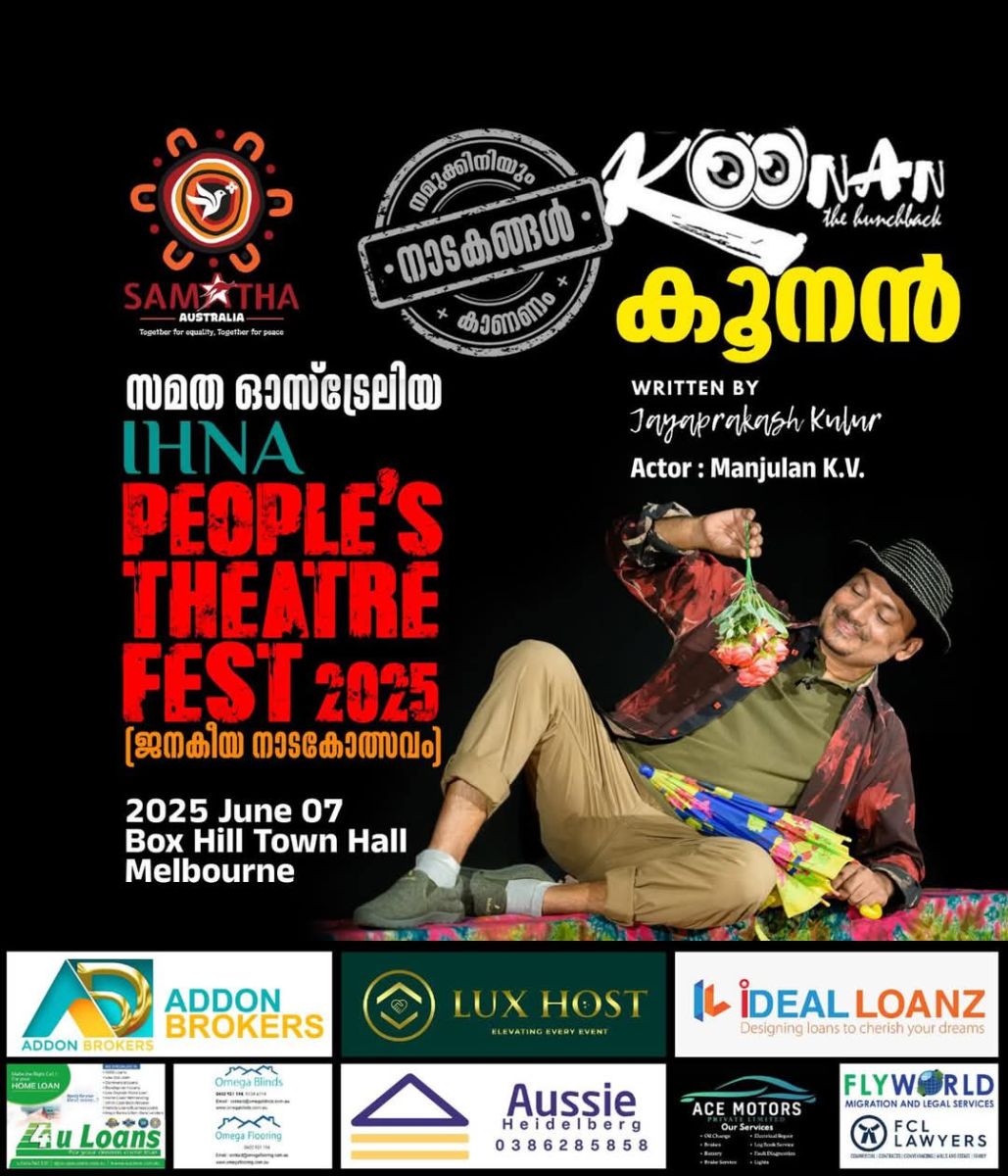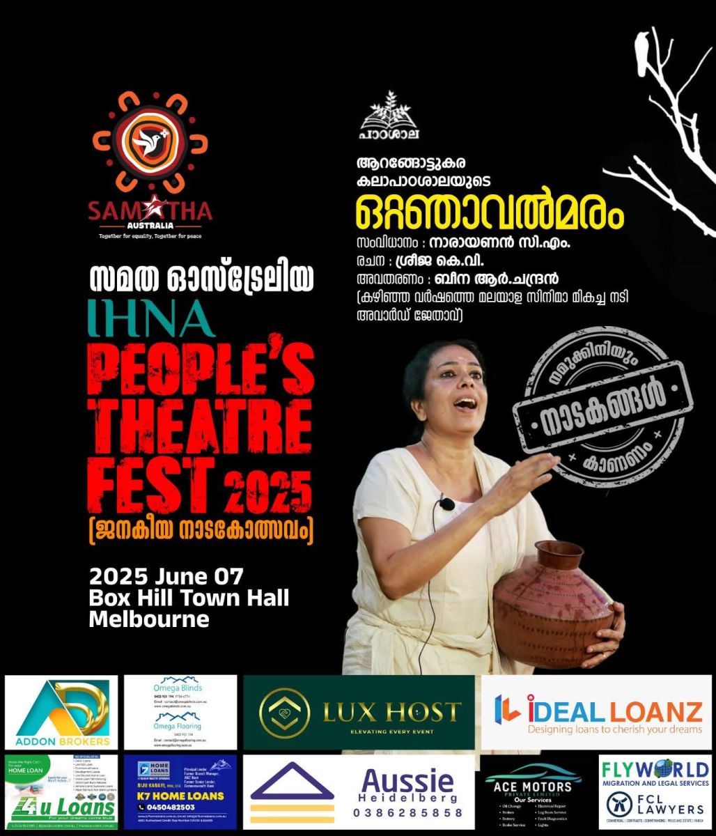 മെൽബണിലെ പുരോഗമന സാംസ്കാരിക സംഘടനയായ സമത ആസ്ട്രേലിയ സംഘടിപ്പിക്കുന്ന ജനകീയ നാടകോത്സവം "IHNA പീപ്പിൾസ് തീയറ്റർ ഫെസ്റ്റ് 2025" ജൂൺ 7 വൈകുന്നേരം 5 മണി മുതൽ മെൽബണിലെ ബോക്സ്ഹിൽ ടൗൺഹാളിൽ നടക്കുന്നു.