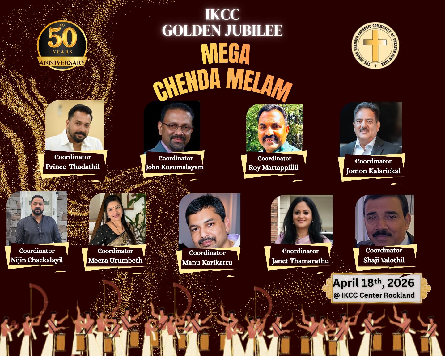 ന്യൂയോർക്കിലെ ഇന്ത്യൻ ക്നാനായ കത്തോലിക്ക കമ്മ്യൂണിറ്റി യുടെ ഗോൾഡൻ ജൂബിലിയോടനുബന്ധിച്ചു മെഗാ ചെണ്ട മേളം അരങ്ങേറുന്നു . ഏപ്രിൽ പതിനെട്ടു ശനിയാഴ്ച നടക്കുന്ന ജൂബിലി ആഘോഷങ്ങളോടനബന്ധിച്ചു ഗ്രെയ്റ്റർ ന്യൂ യോർക്കിലെ വിവിദ്ധ റീജിയനിൽ നിന്നുള്ളവരുടെ മെഗാ ചെങ്ങാ മേളവും താള ലയവും അരങ്ങേറുന്നു ചെണ്ട മേളത്തിന് കൊഴുപ്പേകാൻ ഫിലാഡൽഫിയ ക്നാനായ അസോസിയേഷൻ ക്നാനായ യുവജങ്ങൾ ചെണ്ട മേളങ്ങൾക്കു കൊഴുപ്പേകാൻ കടന്നുവരുന്നു .പ്രിൻസ് തടത്തിൽ, ജോണിച്ചൻ കുസുമാലയം, റോയ് മറ്റപ്പള്ളി, ജോമോൻ കളരിക്കൽ, നിജിൻ ചക്കലയിൽ, മീര ഉറുമ്പേത്, മനു കാരികാട്ടു, ജാനറ്റ് താമരത്തു, ഷാജി വളോത്തിൽ എന്നിവർ നേതൃത്വം നൽകുന്നു