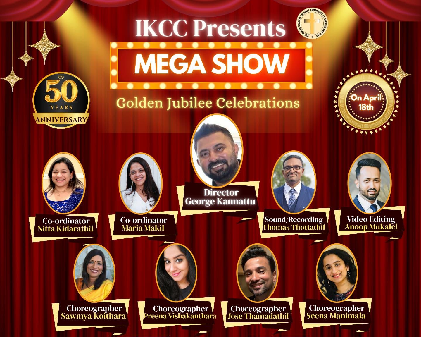 ഇന്ത്യൻ ക്നാനായ കാതോലിക്ക കമ്മ്യൂണിറ്റി ഓഫ് ഗ്രെയ്റ്റർ ന്യൂ യോർക്കിന്റെ ഗോൾഡൻ ജൂബിലി സെലിബ്രേഷനോടനുബന്ധിച്ചു ഏപ്രിൽ പതിനെട്ടിന് റോക്ലാൻഡ് കമ്മ്യൂണിറ്റി സെൻററിൽ മെഗാ ഷോ നടത്തുവാൻ തയാറാകുന്നു. ഗോൾഡൻ ജൂബിലി മെഗാ ഷോ കമ്മറ്റിയിലേക്ക് ജോർജ് കാനാട്ട്, നിറ്റാ കിടാരത്തിൽ, മരിയ മാക്കിയിൽ, തോമസ് തോട്ടത്തിൽ, അനൂപ് മുകളേൽ, സീന മണിമല, ജോസ് താമഠത്തിൽ, പ്രീണ വിശാഖംതറ, സൗമ്യ കോയിത്തറ എന്നിവരെ തിരഞ്ഞെടുക്കുകയും ചെയ്തു. കണ്ണഞ്ചിപ്പിക്കുന്നതും കാലിക പ്രസക്തവുമായ മെഗാ ഷോ അണിയറയിൽ ഒരുങ്ങി കൊണ്ടിരിക്കുന്നു. പരിപാടികൾക്ക് ഐ കെ സി സി പ്രസിഡന്റ് സ്റ്റീഫൻ കിടാരത്തിൽ, വൈസ് പ്രസിഡന്റ് മിനിമോൾ തയിൽ, സെക്രട്ടറി സാൽബി മാക്കിൽ, ജോയിന്റ് സെക്രട്ടറി സാബു തടിപ്പുഴ, ട്രഷറർ രഞ്ജി മണലേൽ തുടങ്ങിയവർ നേതൃത്വം നൽകുന്നു.