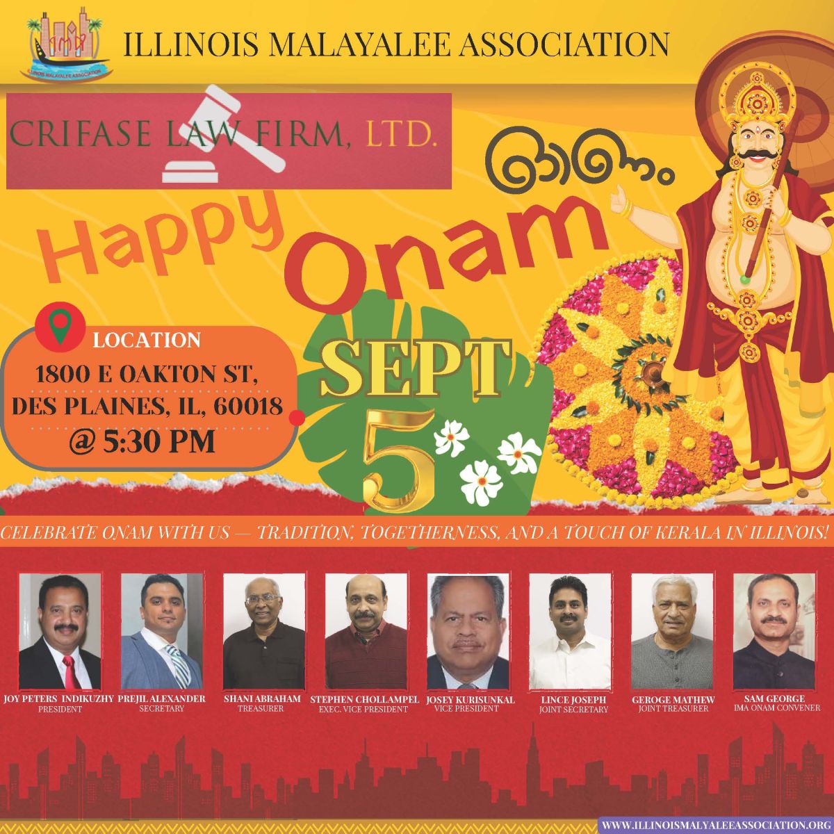 ഈ ഓണാഘോഷങ്ങളിൽ ഉടനീളം പങ്കെടുത്ത് ഈ പരിപാടിയെ വിജയിപ്പിക്കണമെന്ന് ഷിക്കാഗോയിലെ നല്ലവരായ മലയാളി സമൂഹത്തോട് അഭ്യർത്ഥിക്കുന്നതായും