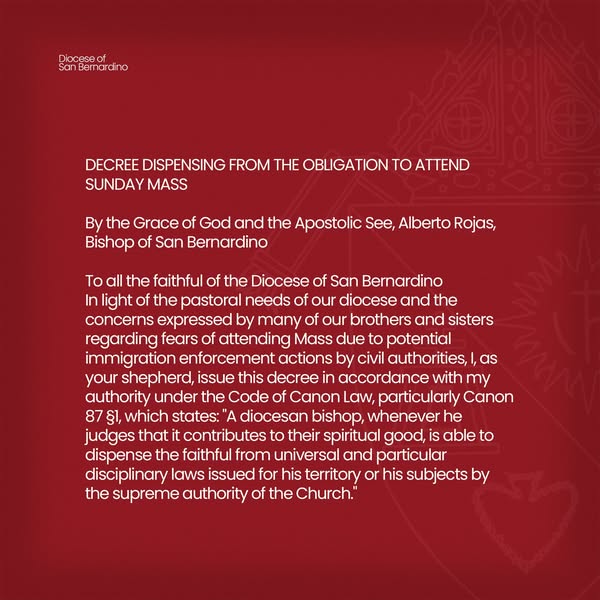 ചൊവ്വാഴ്ചയാണ് ബിഷപ്പ് റോജാസ് തന്റെ ഉത്തരവ് പ്രഖ്യാപിച്ചത്. "കുടിയേറ്റ നിയന്ത്രണ നടപടികളെക്കുറിച്ചുള്ള യഥാർത്ഥ ഭയം കാരണം, കടമയുടെ വിശുദ്ധ ദിവസങ്ങളിൽ കുർബാനകളിൽ പങ്കെടുക്കാൻ കഴിയാത്ത ജാൻ ബെർണാർഡിനോ രൂപതയിലെ എല്ലാ അംഗങ്ങളെയും വിശ്വാസികളെയും ഈ ബാധ്യതയിൽ നിന്ന് ഒഴിവാക്കുന്നു," അദ്ദേഹം ഉത്തരവിൽ വ്യക്തമാക്കി. അതേസമയം, വിശ്വാസികൾ ബദൽ ആത്മീയ ആചാരങ്ങളിൽ ഏർപ്പെടാൻ റോജാസ് പ്രോത്സാഹിപ്പിച്ചു.