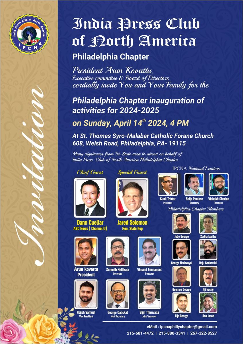 ഫിലഡൽഫിയ: ഇന്ത്യാ പ്രസ് ക്ലബ്ബ് ഓഫ് നോർത്ത് അമേരിക്ക (ഐപിസിഎന്എ) ഫിലഡൽഫിയ ചാപ്റ്ററിന്റെ “അരുൺകോവാട്ട്-സാരഥ്യ-പ്രവർത്തന വർഷങ്ങളുടെ” ഉദ്ഘാടനം, മഞ്ഞപ്പൂക്കളുടെ വിഷു നാളിൽ, സാഹോദര്യ നഗരമായ ഫിലഡൽഫിയയിൽ, പ്രശസ്തരായ പത്രപ്രവർത്തകരുടെ സാന്നിദ്ധ്യത്തിൽ, ഏപ്രിൽ 14, ഞായറാഴ്ച്ച, വൈകുന്നേരം 4 മണിയ്ക്ക്, ബല്ലാഡ് ബ്രൂക്കിൻ്റെ തീരത്ത്, സെൻ്റ് തോമസ് സീറോ മലബാർ മിനി ഓഡിറ്റോറിയത്തിൽ (608 Welsh Rd, Philadelphia, PA 19115), ഏഴുതിരിയിട്ട കേരളാവിളക്കിൽ, സൂര്യമിഴികൾ വിടർത്തും