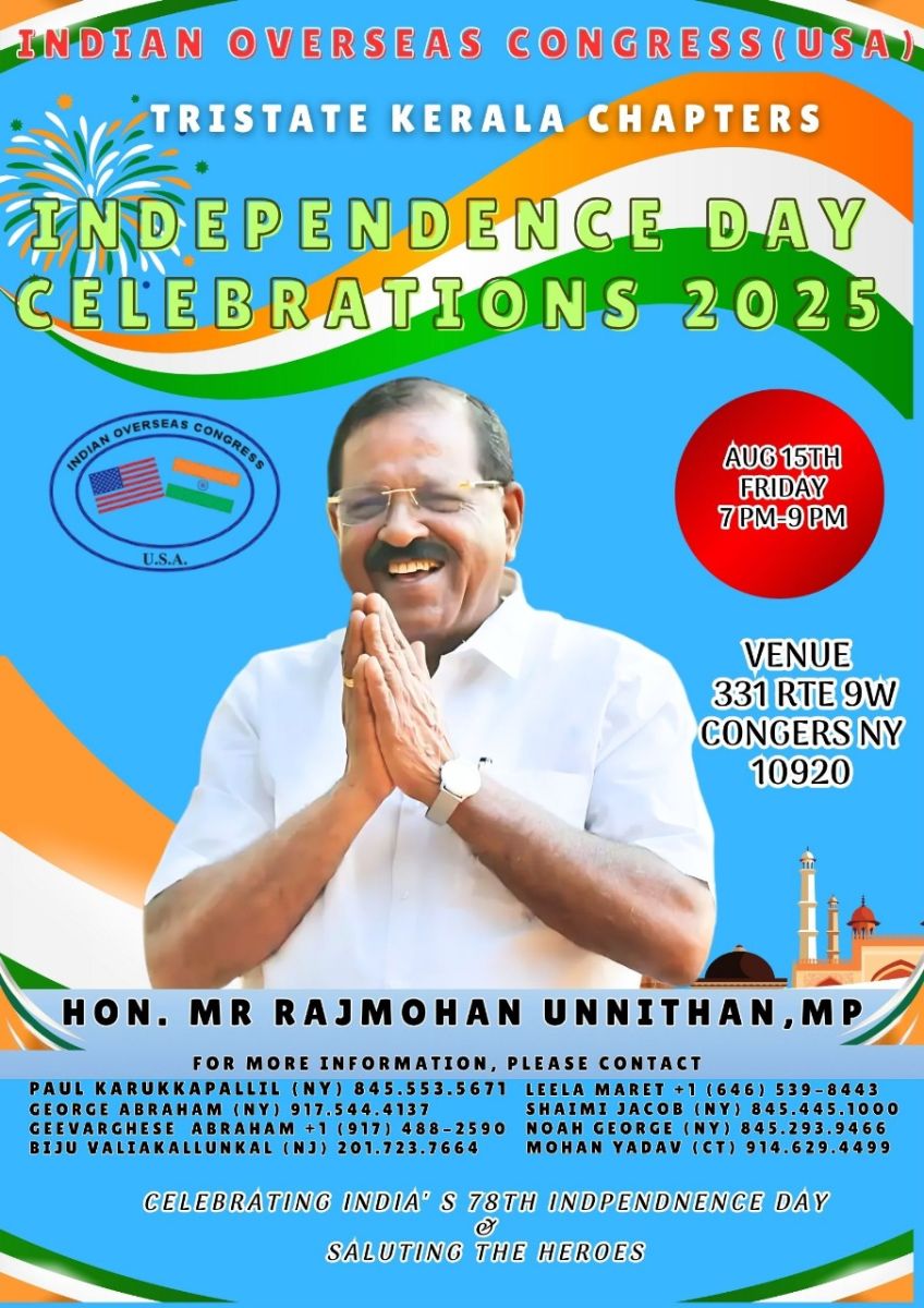 ഐ. ഒ. സി. യു. എസ്. എ കേരള ചാപ്റ്റർ - ട്രൈ സ്റ്റേറ്റ് ഘടകം നടത്തുന്ന 78-ാമത് ഇന്ത്യൻ സ്വാതന്ത്ര്യദിനാഘോഷങ്ങളിൽ കോൺഗ്രസ് നേതാവും കാസർകോട് എം.പിയുമായ രാജ്മോഹൻ ഉണ്ണിത്താൻ മുഖ്യാതിഥിയാകും. ഓഗസ്റ്റ് 15 FRIDAY രാത്രി 7.00 മണി(EST)ക്ക് ന്യൂയോർക്കിലെ കോൺഗേഴ്സിൽ (331 Route 9W)) വച്ചാണ് ആഘോഷങ്ങൾ. ഇന്ത്യൻ ഓവർസീസ് കോൺഗ്രസ് നേതാക്കൾക്ക് പുറമെ വിവിധ സംഘടനകളുടെ നേതാക്കളും പങ്കെടുക്കും.