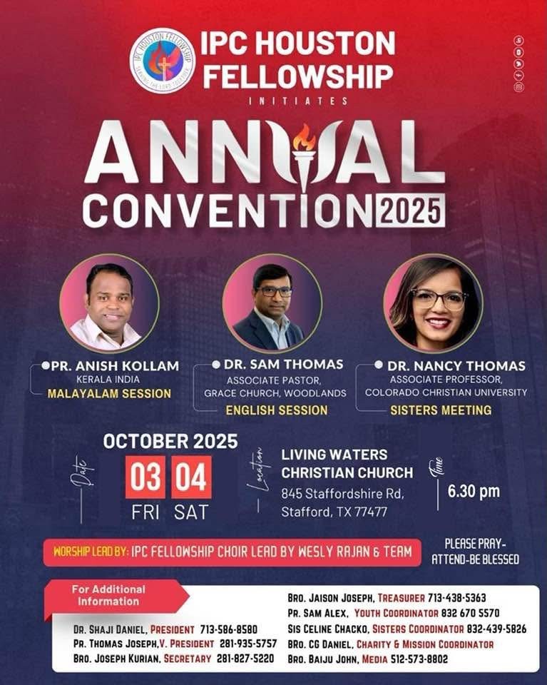 ഹൂസ്റ്റണ്: ഹൂസ്റ്റണിലും സമീപ പ്രദേശങ്ങളിലും ഉള്ള ഇന്ത്യ പെന്തെക്കോസ്ത് സഭകളുടെ ഐക്യ കൂട്ടായ്മയായ ഐ.പി.സി ഹൂസ്റ്റണ് ഫെലോഷിപ്പിന്റെ വാര്ഷിക കണ്വന്ഷന് ഒക്ടോബര് 3 മുതല് 5 വരെ നടക്കുന്നതാണ്. ഒക്ടോബര് 3, 4 എന്നീ തീയതികളില് വൈകിട്ട് ലിവിംഗ് വാട്ടര് ചര്ച്ചില് വെച്ച് നടക്കും. വിലാസം: 845 സ്റ്റാഫോര്ഡ് ഷെയര്, സ്റ്റാഫോര്ഡ്, ടെക്സസ്.