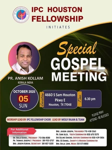 ഞായറാഴ്ച 6.30-ന് പ്രത്യേക സുവിശേഷയോഗം ഐ.പി.സി ഹെബ്രോണ് ഹൂസ്റ്റണില് വെച്ചും നടക്കുന്നതാണ്. വിലാസം: 4660 സൗത്ത് സാം ഹൂസ്റ്റണ്, പാര്ക്ക് വേ ഈസ്റ്റ്, ഹൂസ്റ്റണ് ടെക്സസ്.