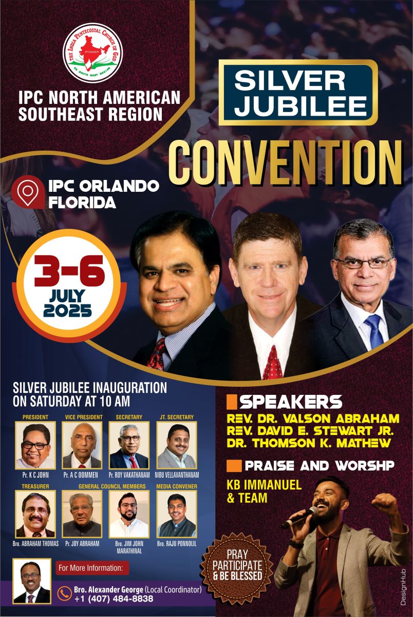 ഫ്ളോറിഡ: ഐ.പി.സി നോർത്ത് അമേരിക്കൻ സൗത്ത് ഈസ്റ്റ് റീജിയൻ രജത ജൂബിലി കൺവൻഷൻ ജൂലൈ മൂന്ന് മുതൽ ആറു വരെ ഒർലാന്റോ ഇന്ത്യ പെന്തക്കോസ്ത് ദൈവസഭയിൽ (IPC Orlando Church, 11531 Winter Garden Vineland Road, Orlando, FL 32836) വെച്ച് നടത്തപ്പെടും.