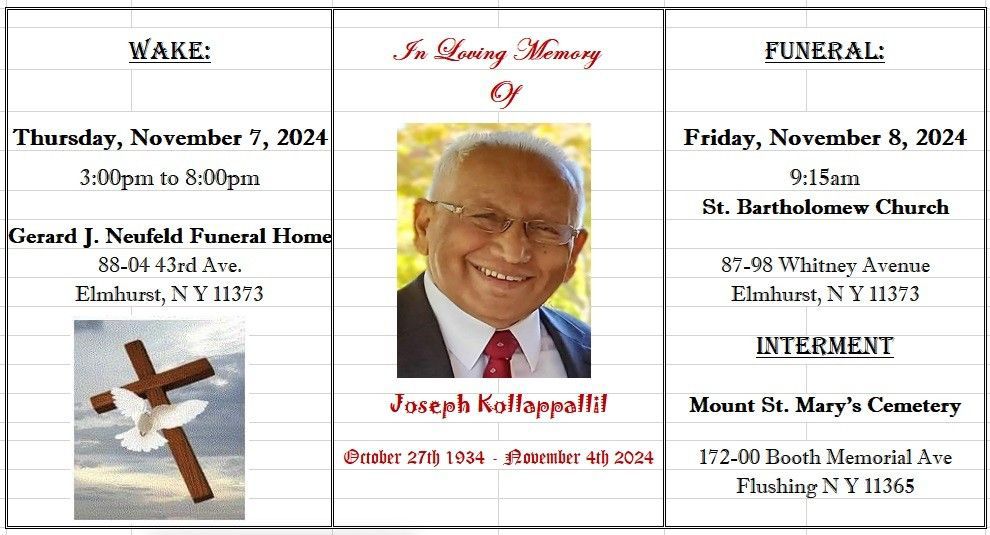 നവംബര് 7, വ്യാഴാഴ്ച ഉച്ചതിരിഞ്ഞ് 3 മുതല് വൈകിട്ട് 8.00 വരെ ന്യയോര്ക്കിലുള്ള എലംഹേസ്റ്റിലെ ജറാര്ഡ് ജെ. ന്യൂഫെഡ് ഫ്യൂണറല് ഫോമില് വച്ചു വേക്ക് നടക്കും. നവംബര് 8, വെള്ളിയാഴ്ച രാവിലെ 9.15ന് സെന്റ് ബാര്ത്തലോമിയ കാത്തലിക് ദേവാലയത്തില് സംസ്ക്കാര ശുശ്രൂഷകള് ആരംഭിക്കുകയും തുടര്ന്ന് ഫ്ളഷിംഗ് മൗണ്ട് സെന്റ് മേരീസ് സെമിത്തേരിയില് സംസ്ക്കാര ശുശ്രൂഷകള് പൂര്ണ്ണമാവുകയും ചെയ്യും.