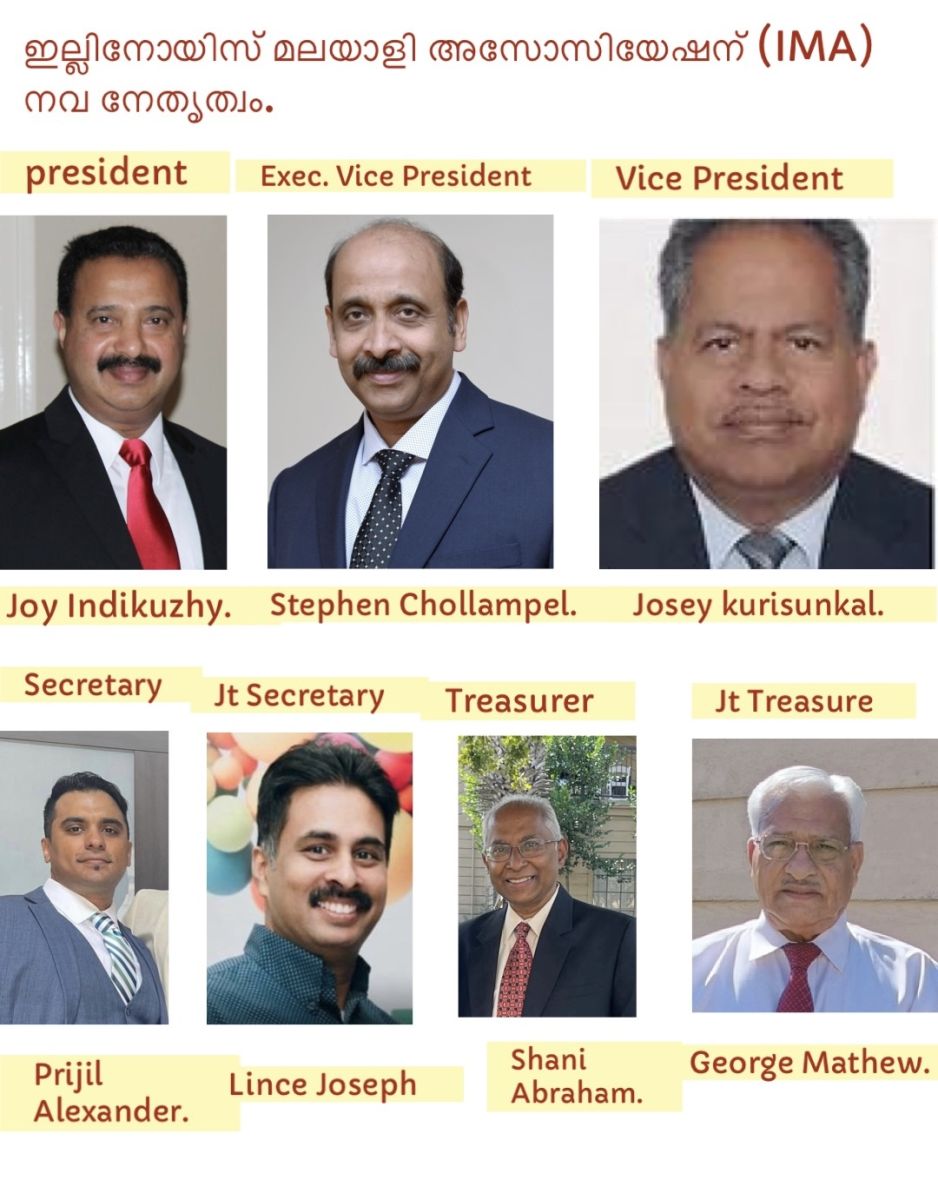 ചിക്കാഗോ: 1991 ൽ സ്ഥാപിതമായ ചിക്കാഗോയിലെ പ്രമുഖ മലയാളി സംഘടനയായ ഇല്ലിനോയിസ് മലയാളി അസോസിയേഷന്റെ അടുത്ത (2025-26) വർഷത്തേക്കുള്ള പുതിയ ഭാരവാഹികളെ തിരഞ്ഞെടുത്തു.പ്രസിഡണ്ട് സ്ഥാനത്തേക്ക് ജോയി ഇണ്ടിക്കുഴിയെ തിരഞ്ഞെടുത്തു. സീനിയർ വൈസ് പ്രസിഡണ്ടായി സ്റ്റീഫൻ ചൊംള്ളമ്പേലും, വൈസ് പ്രസിഡണ്ടായി ജോസി കുരിശിങ്കൽ, സെക്രട്ടറിയായി പ്രജിൽ അലക്സാണ്ടറും തിരഞ്ഞെടുത്തു. കൂടാതെ ജോയിന്റെ സെക്രട്ടറിയായി ലിൻസ് ജോസഫ് താന്നിച്ചൂട്ടിൽ,ട്രഷറാർ ആയി ഷാനി എബ്രഹാം, ജോയിന്റെ ട്രഷറാർ ആയി ജോർജ് മാത്യുവിനെയും തിരഞ്ഞെടുത്തു. നവംബർ 22 വെള്ളിയാഴ്ച വൈകിട്ട് ചിക്കാഗോ കെ സി എസ്