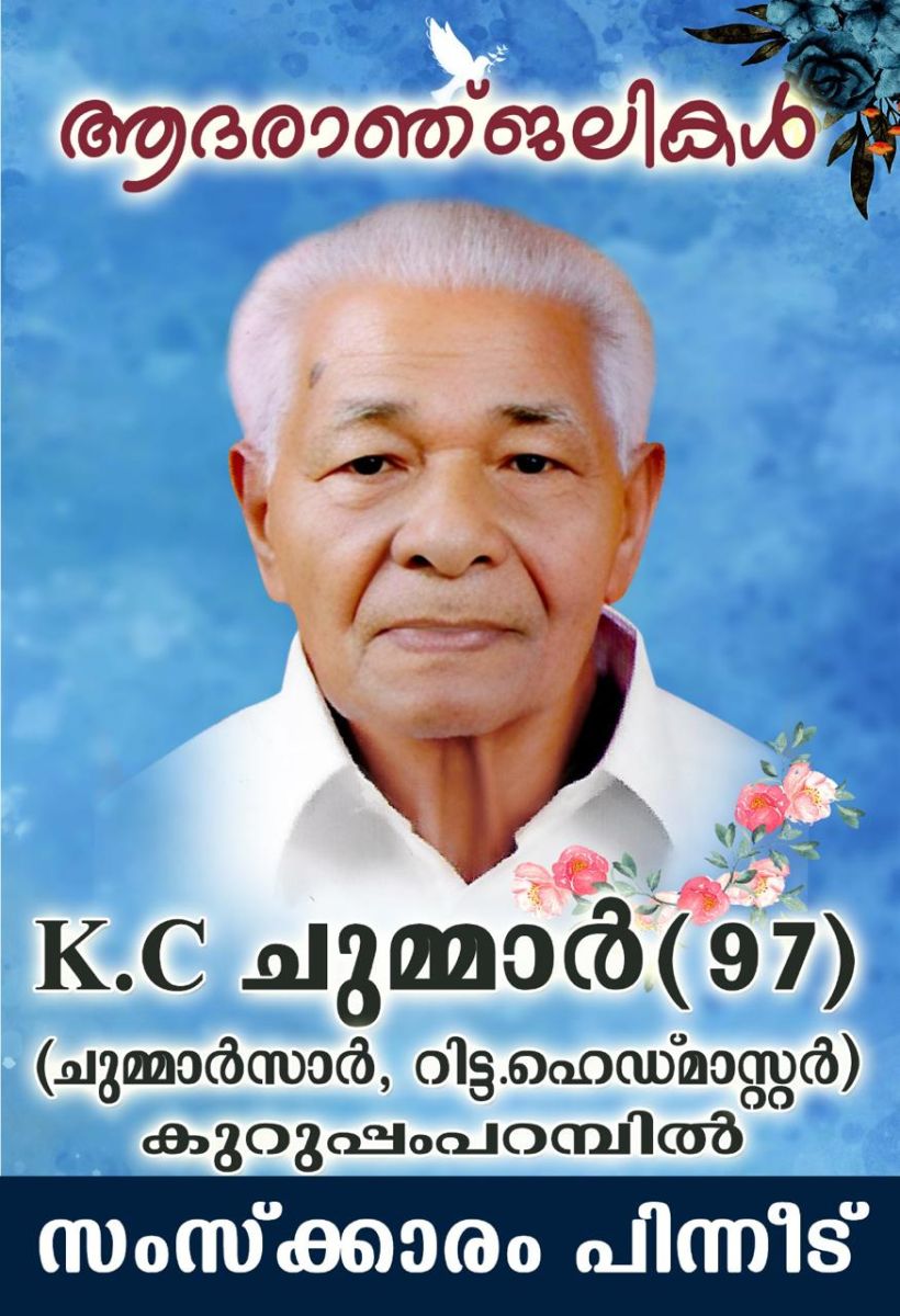 ചിക്കാഗോ:ജോസി കുറുപ്പംപറമ്പിലിന്റെ പിതാവ് കെ സി ചുമ്മാർ ( ചുമ്മാർ സാർ - റിട്ട. ഹെഡ്മാസ്റ്റർ - 97) നിര്യാതനായ വിവരം വ്യസനസമേതം അറിയിച്ചുകൊള്ളുന്നു. ഭാര്യ ആനി ചുമ്മാർ കുമരകം വായിത്തറ കുടുംബാംഗമാണ്.