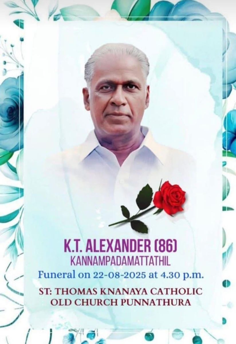 കിടങ്ങൂർ സൗത്ത് :KT അലക്സാണ്ടർ കണ്ണാമ്പടം 86 {അപ്പച്ചൻ ചേട്ടൻ} ഇന്ന് നിര്യാതനായി. ശവസംസ്കാരം വെള്ളിയാഴ്ച {August 22 } വൈകിട്ട് 4 : 30 ന് പുന്നത്തറ സെന്റ് തോമസ് ക്നാനായ കത്തോലിക്കാ പഴയ പള്ളിയിൽ പരേതൻ INDIAN AIR FORCE ൽ സേവനമനുഷ്ഠിച്ചതിനു ശേഷം പാലാ പ്രൈവറ്റ് ബസ് ഓണേഴ്സ് അസോസിയേഷൻ അംഗമായിരുന്നു, സെന്റ് വിൻസന്റ് ഡിപ്പോൾ സൊസൈറ്റി കോട്ടയം അതിരൂപതയുടെ സെക്രട്ടറിയായും സേവനമനുഷ്ഠിച്ചിട്ടുണ്ട്.