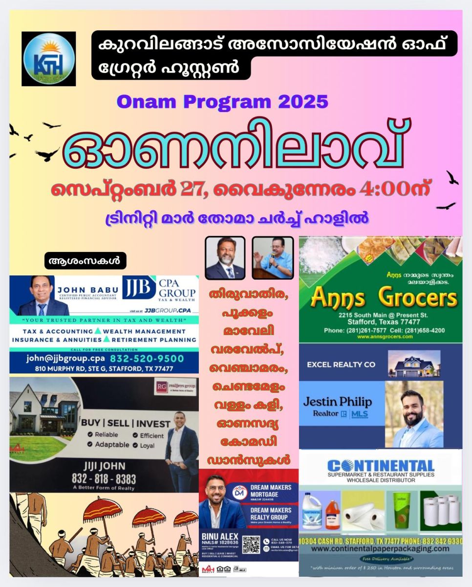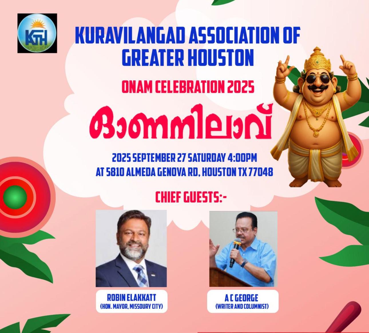 ഹൂസ്റ്റൺ: ടെക്സാസിലെ ഗ്രേറ്റർ ഹൂസ്റ്റൺ ഏരിയയിൽ ആരംഭിച്ചിരിക്കുന്ന കുറവിലങ്ങാട് അസോസിയേഷൻ ഓഫ് ഗ്രേറ്റർ ഹൂസ്റ്റൺ എന്ന സംഘടനയുടെ പ്രഥമ ഓണാഘോഷം “ഓണനിലാവ് ” എന്ന പേരിൽ സെപ്റ്റംബർ 27 ശനിയാഴ്ച വൈകുന്നേരം 4:00 മണി മുതൽ ട്രിനിറ്റി മാർത്തോമാ ചർച്ച് ഹാളിൽ വമ്പിച്ച പരിപാടികളോടെ ആഘോഷിക്കുകയാണ്. ബഹു. മിസ്സൗറി സിറ്റി മേയർ റോബിൻ ഏലക്കാട്ട് ഭദ്രദീപം കൊളുത്തി പരിപാടികൾ ഉദ്ഘാടനം ചെയ്യും.