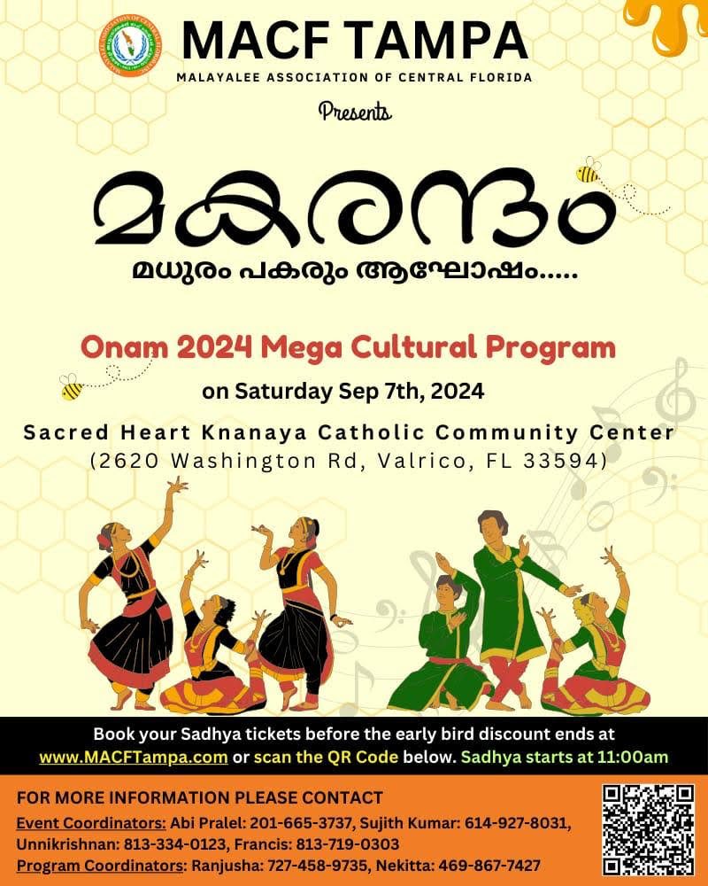 21 ലധികം വിഭവങ്ങളുമായുള്ള ഓണസദ്യ രാവിലെ 11 മുതൽ ആരംഭിക്കും. സദ്യക്കുള്ള കൂപ്പണുകൾ macftampa.com വെബ് സൈറ്റിൽ ലഭ്യമാണ്.