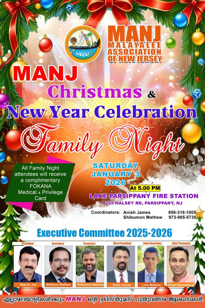 ന്യൂ ജേഴ്സി: ന്യൂ ജേഴ്സിയിലെ പ്രമുഖ സാംസ്കാരിക സംഘടനയായ "മഞ്ച് " ക്രിസ്തുമസും , ന്യൂ ഇയറും ഒരുമിച്ച് ആഘോഷിക്കുന്നു. പാഴ്സിപ്പനി ലേയ്ക് ഫയർ സ്റ്റേഷൻ ഓഡിറ്റോറിയത്തിൽ ജനുവരി 3 ന് വൈകിട്ടു 5 മണിയോടുകൂടി പരിപാടികൾക്ക് തിരി തെളിയും. റെവ.ഫാദർ ഷിബു ഡാനിയേൽ ക്രിസ്മസ് ന്യൂ ഇയർ സന്ദേശം നൽകും , സംഘ ഗാനങ്ങൾ, സ്കിറ്റ്, മാജിക് ഷോ, ഗാനമേള, അതുപോലെ തന്നെ മഞ്ചിന്റെ അനുഗ്രഹീതരായ കലാകാരന്മാരും കലാകാരികളും അവതരിപ്പിക്കുന്ന വിവിധയിനം കലാ പരിപാടികളും ഉണ്ടായിരിക്കുന്നതാണ്. വന്നു ചേരുന്ന എല്ലാവർക്കും മഞ്ചിന്റെ വാർഷിക ഡിന്നറിലും പങ്കെടുക്കാവുന്നതാണ്. സമൂഹത്തിലെ വിവിധ തുറകളിൽപ്പെട്ട പ്രമുഖർ പങ്കെടുക്കുന്ന ഈ പരിപാടിയിലേക്ക് ഏവരെയും ഹാർദ്ദവമായി സ്വാഗതം ചെയ്തുകൊള്ളുന്നു.