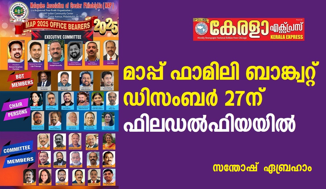 ഫിലഡൽഫിയ : മലയാളി അസോസിയേഷൻ ഓഫ് ഗ്രേറ്റർ ഫിലഡൽഫിയ (മാപ്പ് ) ൻറെ ആഭിമുഖ്യത്തിൽ നടത്തപ്പെടുന്ന ജോളി ബൽസ് 2025ഫാമിലി ബാങ്ക്വറ്റ് ക്രിസ്മസ്-പുതുവത്സര ആഘോഷങ്ങളും ഡിസംബർ മാസം 27 ആം തീയതി ശനിയാഴ്ച 5 pm - 9 pm മുതൽ four points ഷെറാട്ടൺ ഇൽ വെച്ച് (9461 Roosevelt Blvd, Philadelphia,PA-19152) നടക്കുന്നു. ഈ ഫാമിലി ബാങ്ക്വറ്റ് കോഡിനേേററസായി ലിജോ ജോർജ്, ശാലു പൊന്നൂസ്, ബെൻസൺ പണിക്കർ, ജോസഫ് കുരുവിള, എൽദോ വർഗീസ്, കൊച്ചുമോൻ വയലതെ എന്നിവർ പ്രവർത്തിക്കുന്നു.