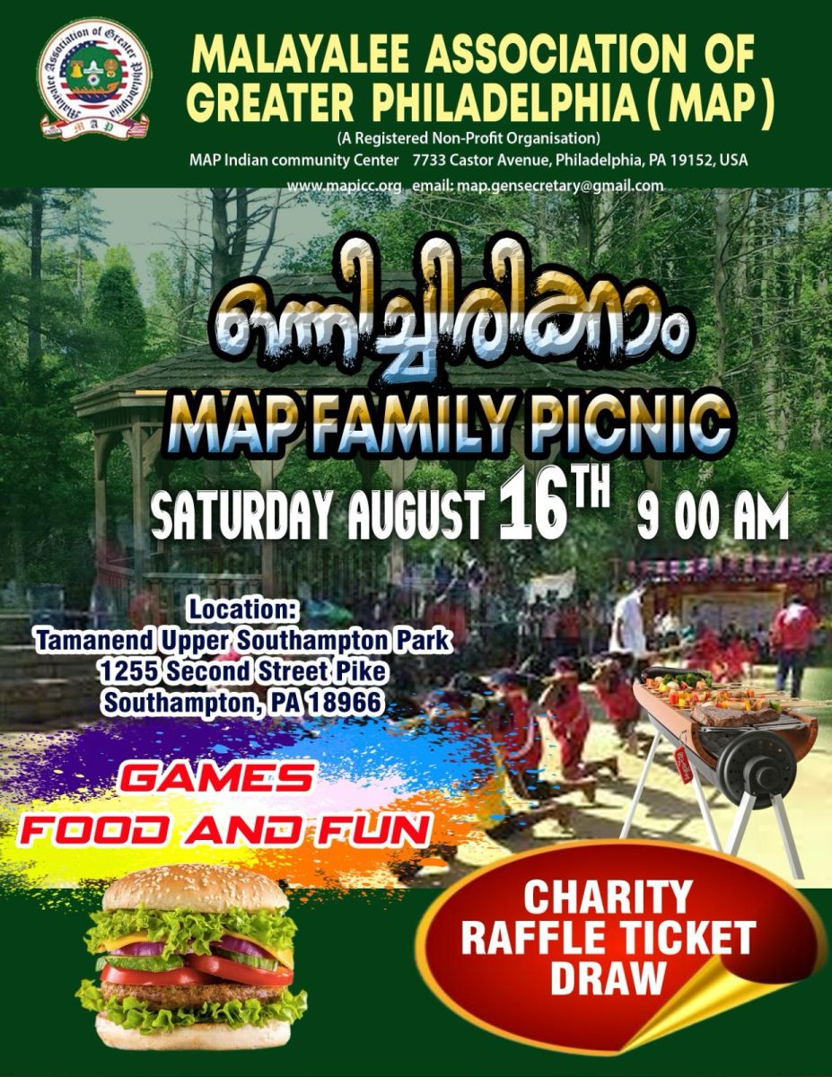 ഫിലഡൽഫിയാ: മലയാളീ അസോസിയേഷൻ ഓഫ് ഗ്രെയ്റ്റർ ഫിലഡൽഫിയായുടെ (മാപ്പ്) പിക്ക്നിക്കും, ചാരിറ്റി റാഫിൾ ടിക്കറ്റ് നറുക്കെടുപ്പും ഓഗസ്റ്റ് 16 - ന് ശനിയാഴ്ച രാവിലെ ഒൻപത് മുതൽ വൈകിട്ട് നാല് വരെ സെക്കന്റ് സ്ട്രീറ്റ് പൈക്കിലുള്ള റ്റാമനെന്റ് പാർക്കിൽ വച്ച് നടത്തപ്പെടുന്നു. (Tamanend Park , 1255 Second Street Pike, Southampton , PA 18966).