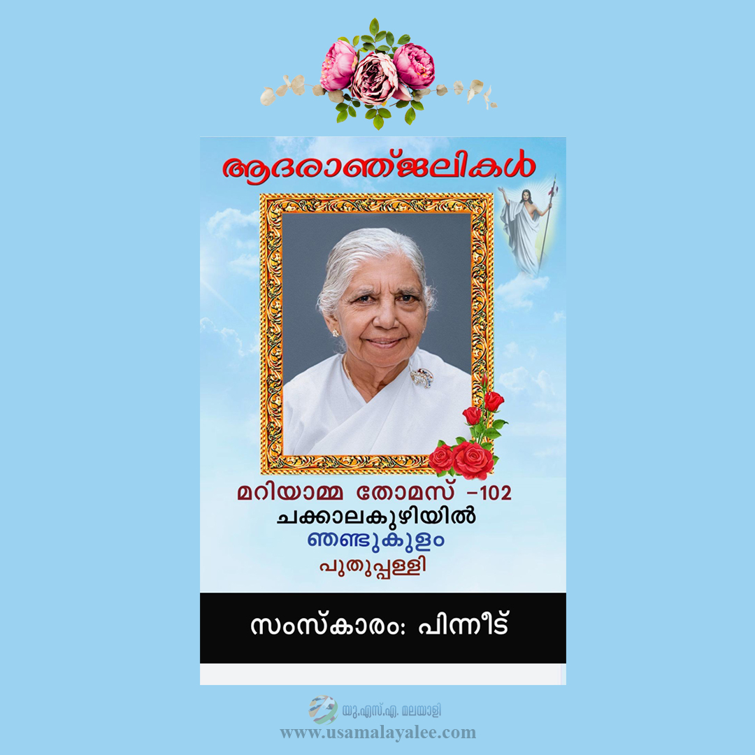 ന്യൂയോര്ക്ക് റോക്ക് ലാന്ഡ് സെന്റ് ജോണ്സ് ഓര്ത്തഡോക്സ് ചര്ച്ച് ഇടവകാംഗമായ ശ്രി ബേബി സി.തോമസിന്റെ മാതാവ് പുതുപ്പള്ളി ഞണ്ടുകുളം ചക്കാലക്കുഴിയില് പരേതനായ പുന്നൂസ് തോമസിന്റെ ഭാര്യ മറിയാമ്മ തോമസ് (106) 2026 ഏപ്രിൽ 5 ഞായറാഴ്ച സ്വവസതിയില് അന്തരിച്ചു.