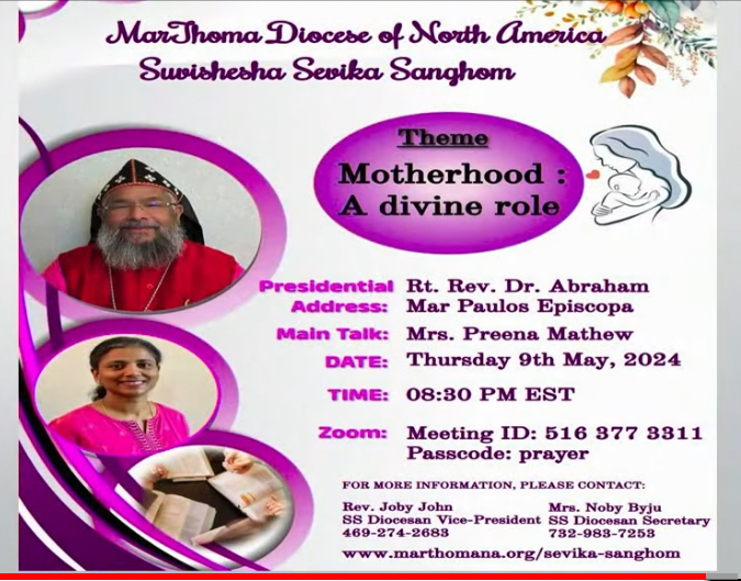 2024 മെയ് 9 വ്യാഴാഴ്ച 08:30 PM EST ആരംഭിക്കുന്ന സൂം സമ്മേളനത്തിൽ നോർത്ത് അമേരിക്ക മാർത്തോമ്മാ ഭദ്രാസനത്തിലെ എല്ലാ വനിതകളും പ്രാർത്ഥനാപൂർവ്വം പങ്കെടുക്കണമെന്ന് സംഘാടകർ അറിയിച്ചു