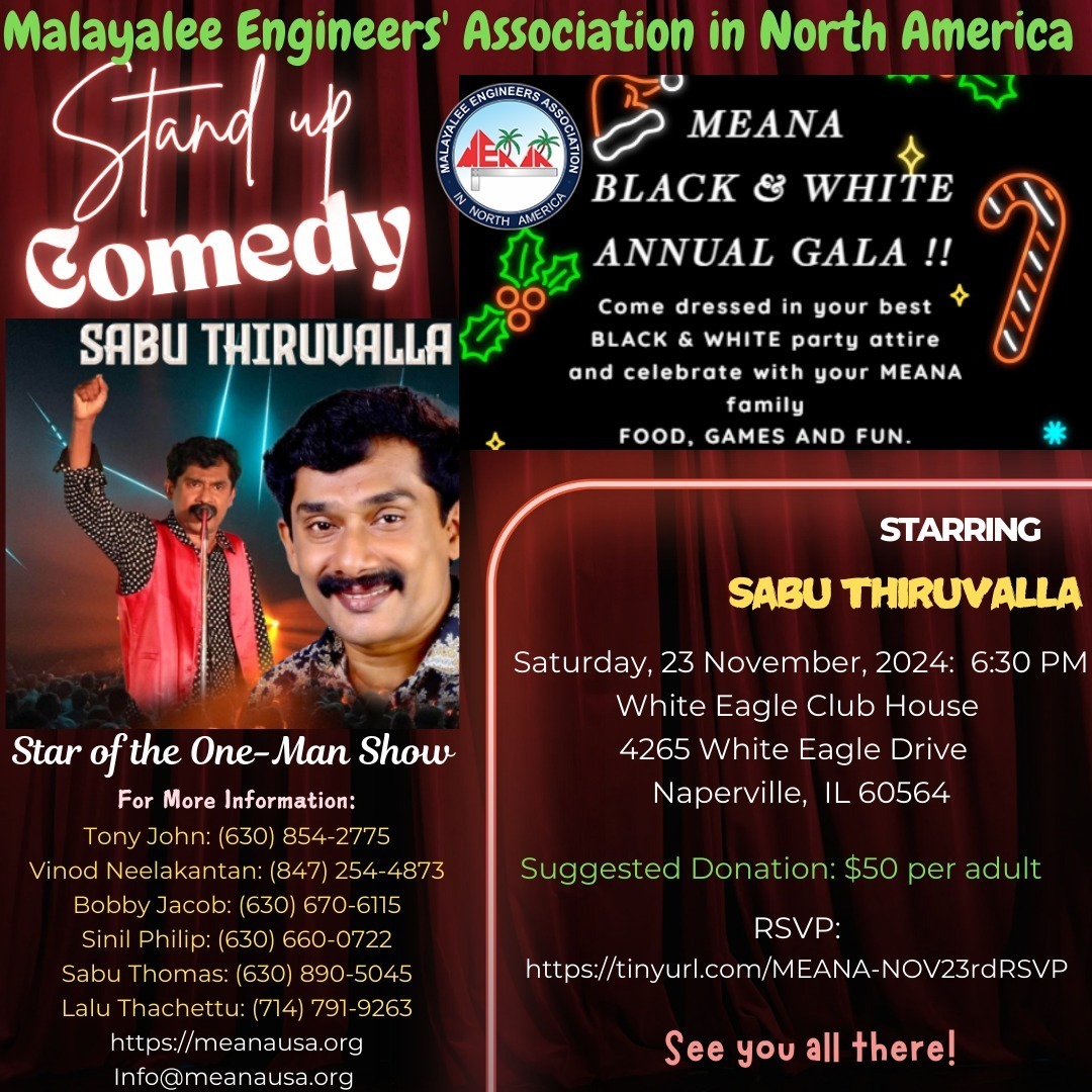 കൂടുതല് വിവരങ്ങള്ക്ക്: ടോണി ജോണ് (പ്രസിഡണ്ട്) 630 854 2775, ഫിലിപ്പ് മാത്യു (പിആര്ഒ) 224 637 0068.