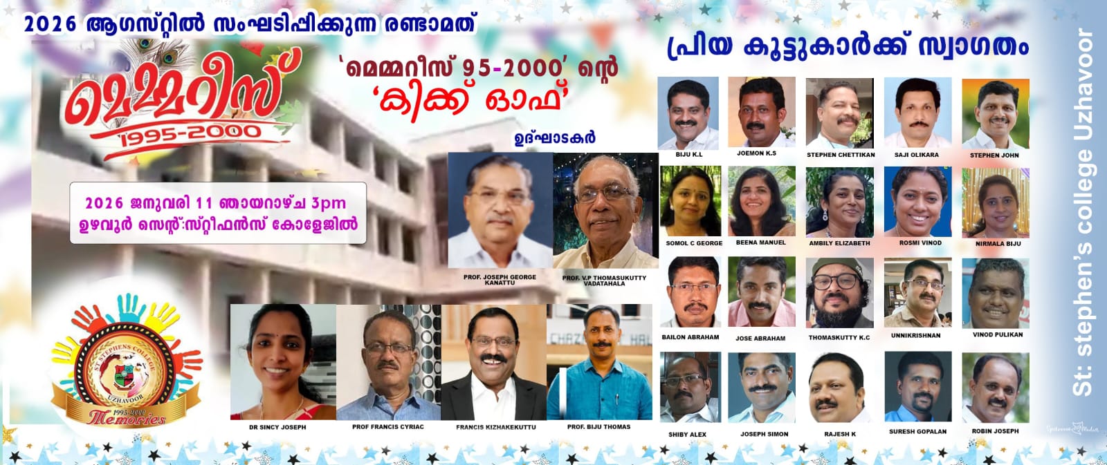 ആഗസ്റ്റ് ആദ്യവരാം നമ്മൾസംഘടിപ്പിക്കുവാൻ ഉദ്ദേശിക്കുന്ന 1995-2000കാലയളവിൽ കോളേജിന്റെഭാഗമായിരുന്നവിദ്യാർത്ഥികളുടെയുംഅദ്ധ്യാപകരുടെയും അനദ്ധ്യാപകരുടെയും മധുരക്കൂട്ടയ്മയായ "മെമ്മറീസ് 95-2000' ന്റെ പ്രവർത്തനങ്ങൾക്ക് തുടക്കം കുറിക്കുവാൻ ഈപുതുവർഷത്തിലെ രണ്ടാമത്തെ ഞായറാഴ്ച ആയ 2026 ജനുവരി 11 ആം തിയതി 3 മണിക്ക് കോളേജിൽ വെച്ചു "മെമ്മറീസ് 95-2000' ന്റെ"കിക്ക്ഓഫ് ' നടത്തുന്നതാണ് ആയതിലേക്കു എല്ലാ കൂട്ടുകാരെയുംപ്രത്യേകം ക്ഷണിക്കുന്നു. നമ്മുടെ കൂട്ടായ്മയുടെ വിജയത്തിന് വേണ്ടിയുള്ള വിവിധ കമ്മിറ്റികളുടെ രൂപീകരണം ആവശ്യം ആയതിനാൽ എല്ലാവരുടെയും മഹനിയ സാന്നിത്യം ഉറപ്പാക്കുവാൻ ശ്രദ്ധിക്കുമല്ലോ.ഈഗ്രൂപ്പിൽ addആയിട്ടില്ലാത്ത ഈ കാലഘട്ടത്തിലുള്ള മറ്റ് കൂട്ടുകാരെ കൂടി പങ്കെടുപ്പിക്കുവാൻ ശ്രമിക്കുമെന്ന് പ്രതീ ഷിക്കുന്നു.