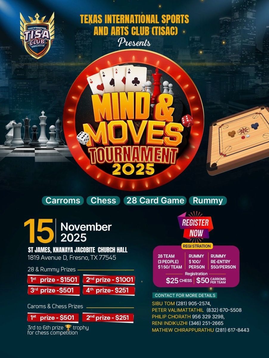 ഹൂസ്റ്റൺ : സംഘാടക മികവ് കൊണ്ടും ജന പങ്കാളിത്തം കൊണ്ടും ജന ശ്രദ്ധയാകർഷിച്ച അന്താരാഷ്ട്ര വടംവലി സീസൺ - 4 ന്റെ വൻ വിജയത്തിന് ശേഷം ടെക്സാസ് ഇന്റർനാഷണൽ സ്പോർട്സ് ആൻഡ് ആർട്സ് ക്ലബ് (TISAC) “മൈൻഡ് & മൂവ്സ് ടൂർണമെന്റ് 2025” സംഘടിപ്പിക്കുന്നു.