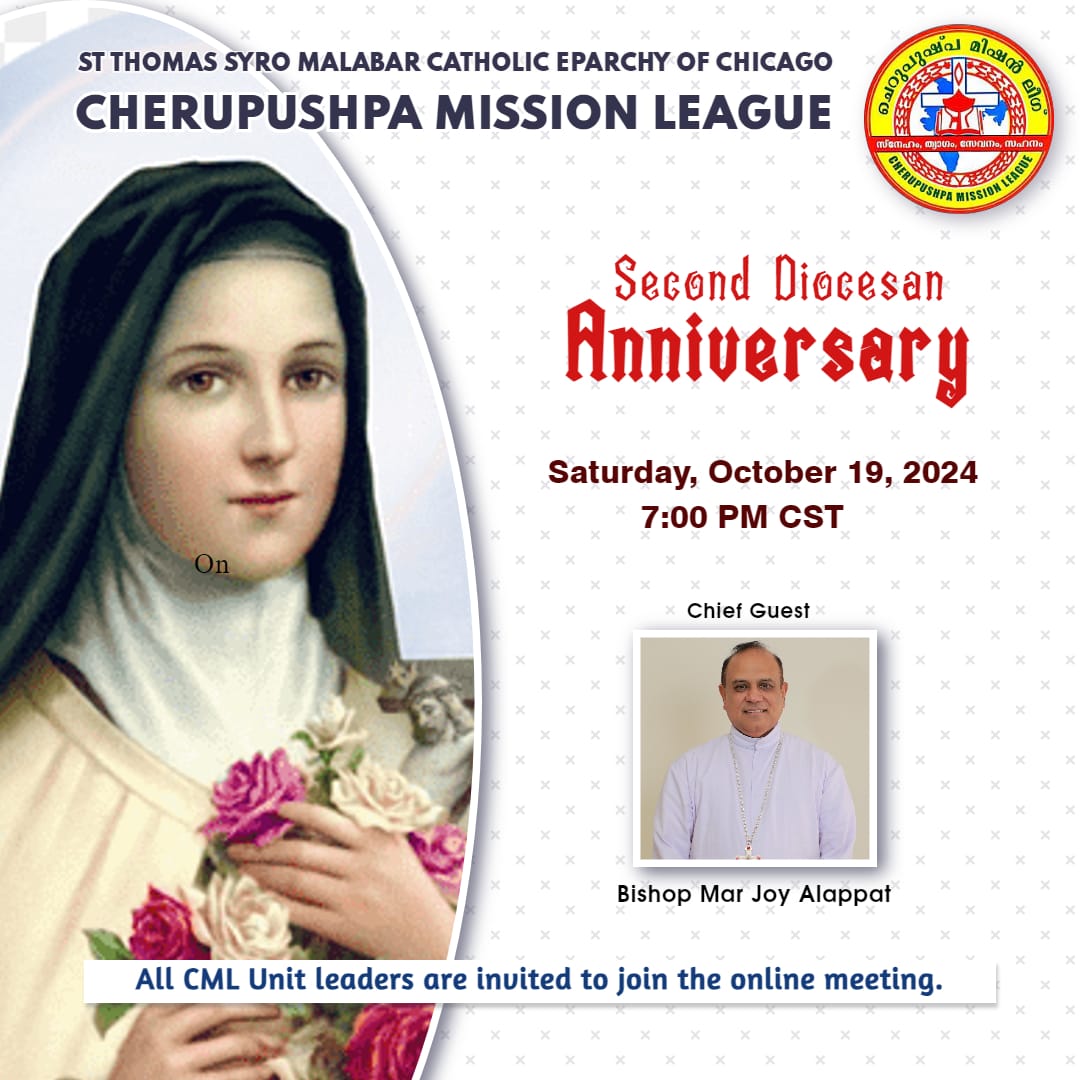 ചിക്കാഗോ : ചെറുപുഷ്പ മിഷൻ ലീഗ് ചിക്കാഗോ രൂപതയുടെ രണ്ടാം വാർഷികാഘോഷങ്ങൾ ഒക്ടോബർ 19ന് ഓൺലൈനായി നടത്തും. ചിക്കാഗോ രൂപതാ ബിഷപ്പ് മാർ ജോയ് ആലപ്പാട്ട് വാർഷികാഘോഷങ്ങൾ ഉദ്ഘാടനം നിർവഹിക്കും. ചെറുപുഷ്പ മിഷൻ ലീഗ് ചിക്കാഗോ രൂപതാ പ്രസിഡന്റ് സിജോയ് സിറിയക് പറപ്പള്ളിൽ അധ്യക്ഷത വഹിക്കും. മിഷൻ ലീഗ് രൂപതാ ജനറൽ സെക്രട്ടറി ടിസൺ തോമസ് വാർഷിക റിപ്പോർട്ട് അവതരിപ്പിക്കും. മിഷൻ ലീഗ് രൂപതാ ഡയറക്ടർ റവ. ഡോ. ജോർജ് ദാനവേലിൽ. അസിസ്റ്റന്റ് ഡയറക്ടർ ഫാ.ബിൻസ് ചേത്തലിൽ, വൈസ് പ്രസിഡന്റ് ജിമ്മിച്ചൻ മുളവന എന്നിവർ പ്രസംഗിക്കും.