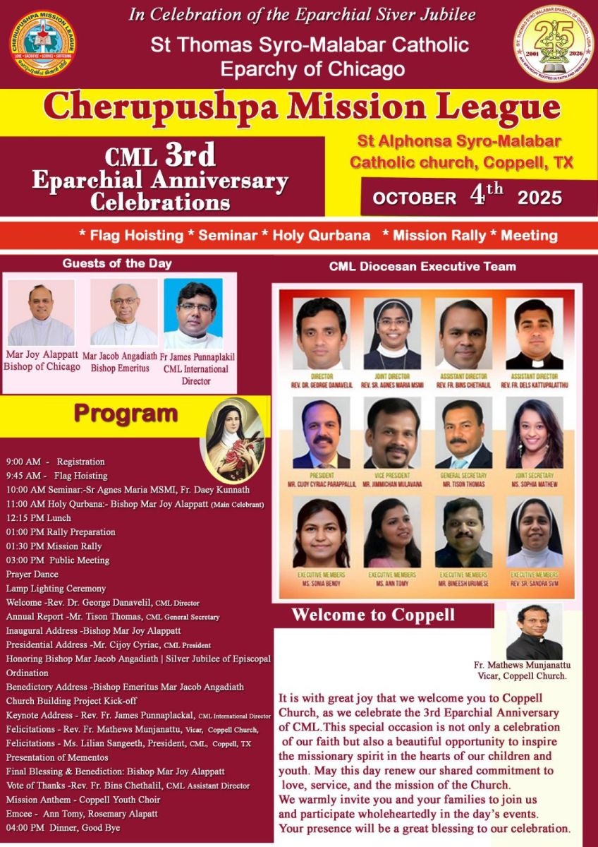 കൊപ്പേൽ: ഒക്ടോബർ 4 ശനിയാഴ്ച്ച സംഘടിപ്പിക്കുന്ന ചെറുപുഷ്പ മിഷൻ ലീഗ് (സി.എം.എൽ.) ചിക്കാഗോ രൂപതയുടെ മൂന്നാം വാർഷികത്തിന് കൊപ്പേൽ സെന്റ് അൽഫോൻസാ സിറോ-മലബാർ കത്തോലിക്കാ ഇടവക ഒരുങ്ങി. ടെക്സാസ്, ഒക്കലഹോമ സംസ്ഥാനങ്ങളിലെ ഇടവകളിൽ നിന്നുള്ള 600ൽ പരം കുട്ടികളും മുതിർന്നവരും പങ്കുചേരുന്ന ഈ പരിപാടിക്ക് എല്ലാ ക്രമീകരണങ്ങളും പൂർത്തിയായതായി കൊപ്പേൽ ഇടവക വികാരി ഫാ. മാത്യൂസ് മുഞ്ഞനാട്ട്, മിഷൻ ലീഗ് ഇടവക കോർഡിനേറ്റർമാരായ ആൻ ടോമി, റോസ് മേരി ആലപ്പാട്ട് എന്നിവർ അറിയിച്ചു.