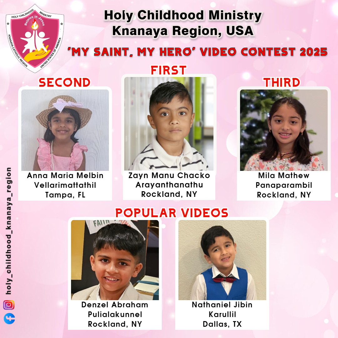 ചിക്കാഗോ: വടക്കേ അമേരിക്കയിലെ ക്നാനായ കാത്തലിക് റീജിയണിലെ ഹോളി ചൈൽഡ് ഹുഡ് മിനിസ്റ്റി (തിരുബാല സഖ്യം) യുടെ ആഭിമുഖ്യത്തിൽ നടത്തിയ "മൈ സെയിന്റ്, മൈ ഹീറോ" വീഡിയോ മത്സരത്തിന്റെ വിജയികളെ പ്രഖ്യാപിച്ചു.