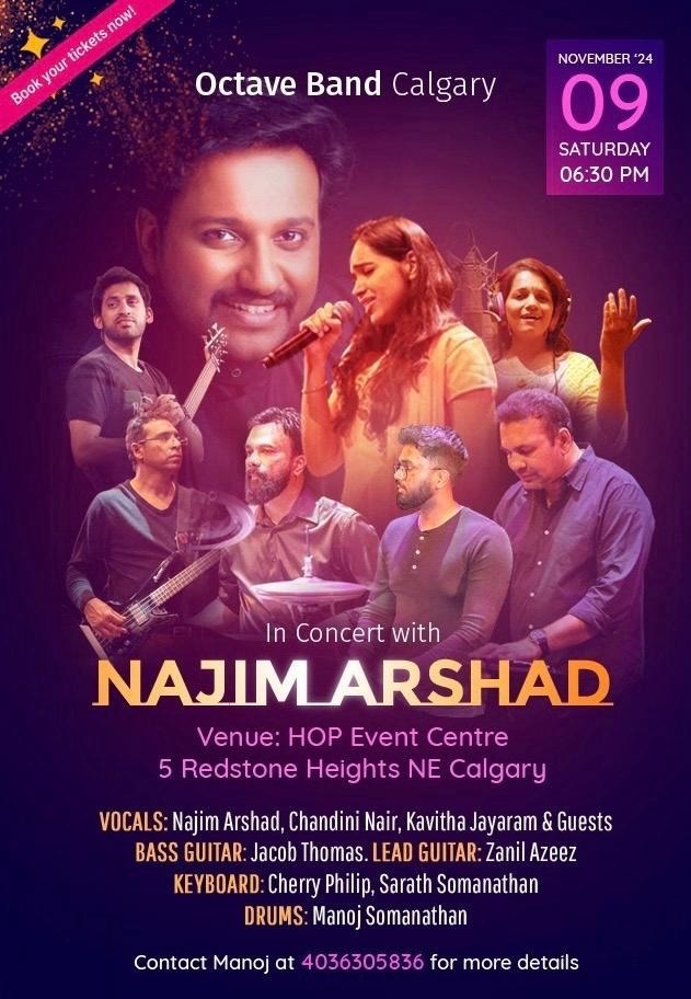 കാൽഗറി: പ്രശസ്ത പിന്നണി ഗായകനും സംസ്ഥാന അവാർഡ് ജേതാവുമായ നജിം അർഷാദിൻറെ സംഗീത നിശക്കായി കാൽഗറി ഒരുങ്ങുന്നു . നവംബർ ഒൻപതാം തീയതി ശനിയാഴ്ച 6.30നു HOP സെന്ററിൽ വച്ചാണ് പരിപാടി നടക്കുന്നത് . മലയാളം, തമിഴ്, ഹിന്ദി ഗാനങ്ങളാൽ ശ്രദ്ധേയമാകുന്ന ഈ സംഗീത പരിപാടി സംഘടിപ്പിക്കുന്നത് കാൽഗരി ആസ്ഥാനമായ ഒക്ടവ് ബാൻഡ് ആണ്.