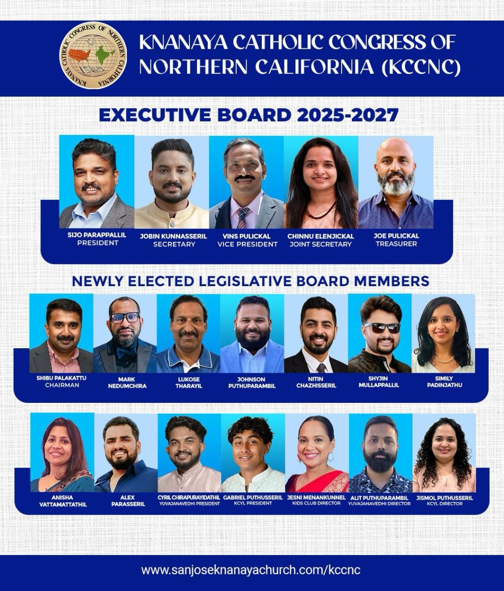സാൻ ഹോസെ: കെ.സി.സി.എൻ.സി.യുടെ വാർഷിക ജനറൽ ബോഡി യോഗത്തിനു ശേഷം 2025–2027 കാലയളവിലേക്കുള്ള പുതിയ എക്സിക്യൂട്ടീവ് ബോർഡും ലെജിസ്ലേറ്റീവ് ബോർഡും തെരഞ്ഞെടുക്കപ്പെട്ടു.