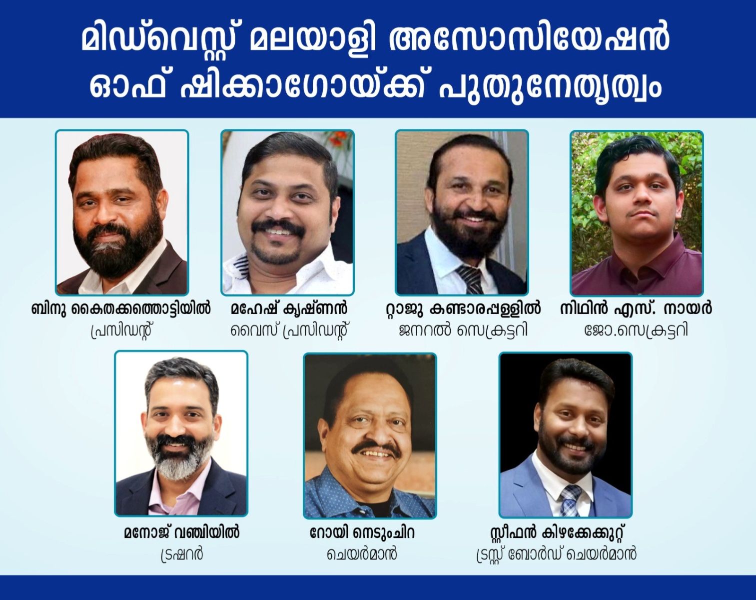 ഷിക്കാഗോ: മിഡ്വെസ്റ്റ് മലയാളി അസോസിയേഷന് പുതിയ നേതൃത്വം. ഷിക്കാഗോയിലെ നോര്ത്ത് ബൂക്കില് ചേര്ന്ന വാര്ഷികപൊതുയോഗത്തില് മിഡ്വെസ്റ്റ് മലയാളി അസോസിയേഷന് ഓഫ് ഷിക്കാഗോയുടെ 2025 -27 കാലയളവിലേക്കുള്ള പുതിയ ഭരണസമിതിയെ തെരഞ്ഞെടുത്തു. പ്രസിഡന്റായി ശ്രീ. ബിനു കൈതക്കത്തൊട്ടിയില്, വൈസ് പ്രസിഡന്റായി ശ്രീ. മഹേഷ് കൃഷ്ണന്, ജനറല് സെക്രട്ടറിയായി ശ്രീ. റ്റാജു കണ്ടാരപ്പള്ളില്, ജോയിന്റ് സെക്രട്ടറിയായി ശ്രീ. നിഥിന് എസ്. നായര്, ട്രഷററായി ശ്രീ. മനോജ് വഞ്ചിയില് എന്നിവരെ ഐകകണ്ഠേന തെരഞ്ഞെടുത്തു. രണ്ടുവര്ഷത്തെ സേവനത്തിനുശേഷം സ്ഥാനമൊഴിയുന്ന പ്രസിഡന്റ് ശ്രീ. റോയി നെടുംചിറ പുതിയ ഭാരവാഹികള്ക്ക് ആശംസകള് നേര്ന്നു. ശ്രീ. മഹേഷ് കൃഷ്ണന് പ്രവര്ത്തന റിപ്പോര്ട്ടും, ശ്രീ. സാബു തറത്തട്ടേല് സാമ്പത്തിക റിപ്പോര്ട്ടും അവതരിപ്പിച്ചു. സ്ഥാപക അംഗങ്ങളായ ശ്രീ. പീറ്റര് കുളങ്ങര, ശ്രീ. സതീശ് നായര്, ശ്രീ. വര്ഗീസ് പാലമലയില്, ശ്രീമതി വിജി നായര്, ശ്രീ. ജോണ് പാട്ടപ്പതി തുടങ്ങിയവരുടെ നേതൃത്വത്തില് തെരഞ്ഞെടുപ്പ് പ്രവര്ത്തനങ്ങള് നിയന്ത്രിച്ചു. ട്രസ്റ്റ് ബോര്ഡ് ചെയര്മാനായി ശ്രീ.സ്റ്റീഫന് കിഴക്കേക്കുറ്റും, ചെയര്മാനായി ശ്രീ. റോയി നെടുംചിറയും നിയമിതരായി. ശ്രീ. പോള്സണ് കുളങ്ങര ഏവര്ക്കും നന്ദി പറഞ്ഞു. സ്നേഹവിരുന്നോടെ യോഗം അവസാനിച്ചു.