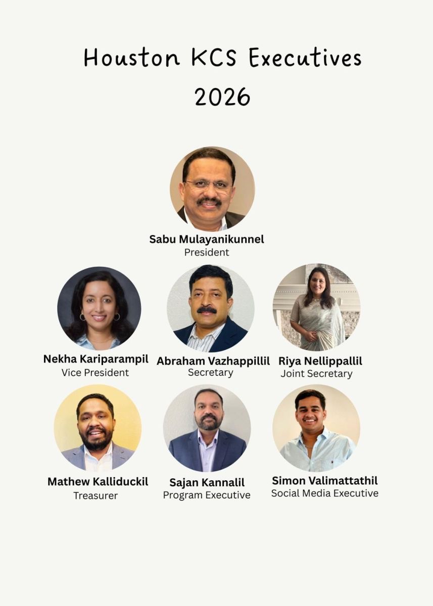 ഹൂസ്റ്റണ്: ഹൂസ്റ്റണിലെ ക്നാനായ സമുദായത്തെ അര്പ്പണ ബോധത്തോടെ സേവിക്കുന്നതിന് സാമൂഹിക പ്രതിബദ്ധതയുള്ളവരുടെ പുതിയ ടീം നിയോഗിക്കപ്പെട്ടു. ഹൂസ്റ്റണ് ക്നാനായ കാത്തലിക് സൊസൈറ്റിയുടെ (എച്ച്.കെ.സി.എസ്) 2026 ഭരണ സമിതിയുടെ പ്രസിഡന്റായി സാബു ജോസഫ് മുളയാനിക്കുന്നേലും വൈസ് പ്രസിഡന്റായി നേഖ മാത്യു കരിപ്പറമ്പിലും തിരഞ്ഞെടുക്കപ്പെട്ടു. എബ്രഹാം വാഴപ്പള്ളില് ആണ് സെക്രട്ടറി.