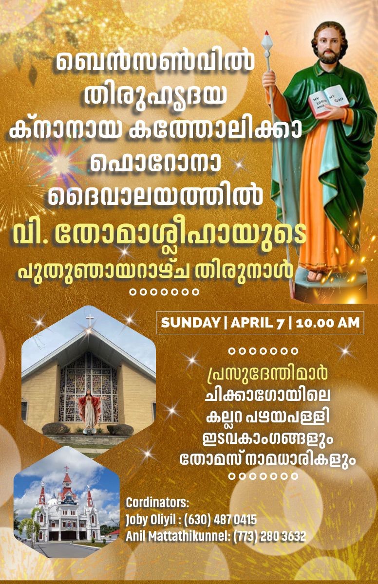 ചിക്കാഗോ: ബെൻസൻവിൽ തിരുഹൃദയ ക്നാനായ കത്തോലിക്കാ ദേവാലയത്തിൽ പുതുഞായർ തിരുനാൾ ആഘോഷിക്കുന്നു. പുതുഞായർ ദിവസം ചിക്കാഗോയിലെ കല്ലറ പഴയ പള്ളി ഇടവകാംഗങ്ങൾ എല്ലാവരുടെയും നേതൃത്വത്തിൽ സ്വർഗ്ഗീയ മദ്ധ്യസ്ഥനായ വി.തോമശ്ലിഹായുടെ തിരുനാൾ പ്രത്യേകം ആഘോഷിക്കുന്നു. രാവിലെ 10 am ന് വിശുദ്ധ കുർബ്ബാനയും തുടർന്ന് നേർച്ച സമർപ്പണവും സ്നേഹവിരുന്നും ഒരുക്കിയിട്ടുണ്ട്. ജോബി ഓളിയിൽ, അനിൽ മറ്റത്തിക്കുന്നേൽ എന്നിവർ പ്രസുദേന്തി കോർഡിനേറ്റർമാരായി കല്ലറ പഴയപള്ളി ഇടവകാംഗങ്ങളെ ഒരുമിച്ചു കൂട്ടിയാണ് തിരുനാൾ സംഘടിപ്പിക്കുന്നത്. നാട്ടിൽ ഇതേ ദിവസം ഇടവക ദേവാലയ തിരുനാൾ ആഘോഷിക്കുമ്പോൾ ചിക്കാഗോയിലെ കല്ലറ ഇടവക ജനം ബെൻസൻവിൽ ദേവാലയത്തിൽ ഒരുമിച്ചുകൂടി നാട്ടിൽ ആഘോഷിച്ചിരുന്ന തിരുനാൾ ഓർമ്മകളെ വീണ്ടും സജീവമാക്കുകയും പുതിയ തലമുറയിലേയ്ക്ക് പകരുകയും ചെയ്യുന്നത് എല്ലാവർക്കും പ്രചോദനമാകട്ടെയെന്ന് വികാരി ഫാ. തോമസ് മുളവനാൽ ആശംസിച്ചു. തിരുനാൾ ആഘോഷക്രമീകരണങ്ങൾക്ക് അസി. വികാരി ഫാ. ബിൻസ് ചേത്തലിൽ, ട്രസ്റ്റിമാരായ തോമസ് നെടുവാമ്പുഴ, സാബു മുത്തോലം, മത്തിയാസ് പുല്ലാപ്പള്ളി, കിഷോർ കണ്ണാല, ജെൻസൺ ഐക്കരപ്പറമ്പിൽ എന്നിവർ നേതൃത്വം നൽകും. ലിൻസ് താന്നിച്ചുവട്ടിൽ പി.ആർ.ഓ.