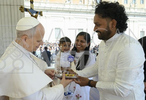 ക്നാനായ കുടിയേറ്റയാത്രയുടെ പ്രതീകമായ കപ്പൽ മാതൃക സമ്മാനിച്ച് ആഗോള കത്തോലിക്കാ സഭയുടെ തലവൻ ലിയോ 14 -ാമൻ മാർപാപ്പയെ സന്ദർശിച്ച് നവ ക്നാനായ കുടുംബം.റോമിൽ വെച്ച് നടത്തപ്പെട്ട ജനറൽ ഓഡിയൻസ് പരിപാടിയിലാണ് കോട്ടയം ക്നാനായ കത്തോലിക്കാ അതിരൂപതയിലെ ചെറുകര ഇടവകാംഗങ്ങളായ പാറയിൽ ലിബിൻ ജോസിനും,മിരാൾഡക്കും മകൻ ജോസഫിനും മാർപാപ്പയുമായുള്ള പ്രത്യേക കൂടികാഴ്ചയിലൂടെ സന്ദർശിക്കാനും സ്നേഹസമ്മാനം നൽകാനും സാധിച്ചത്.